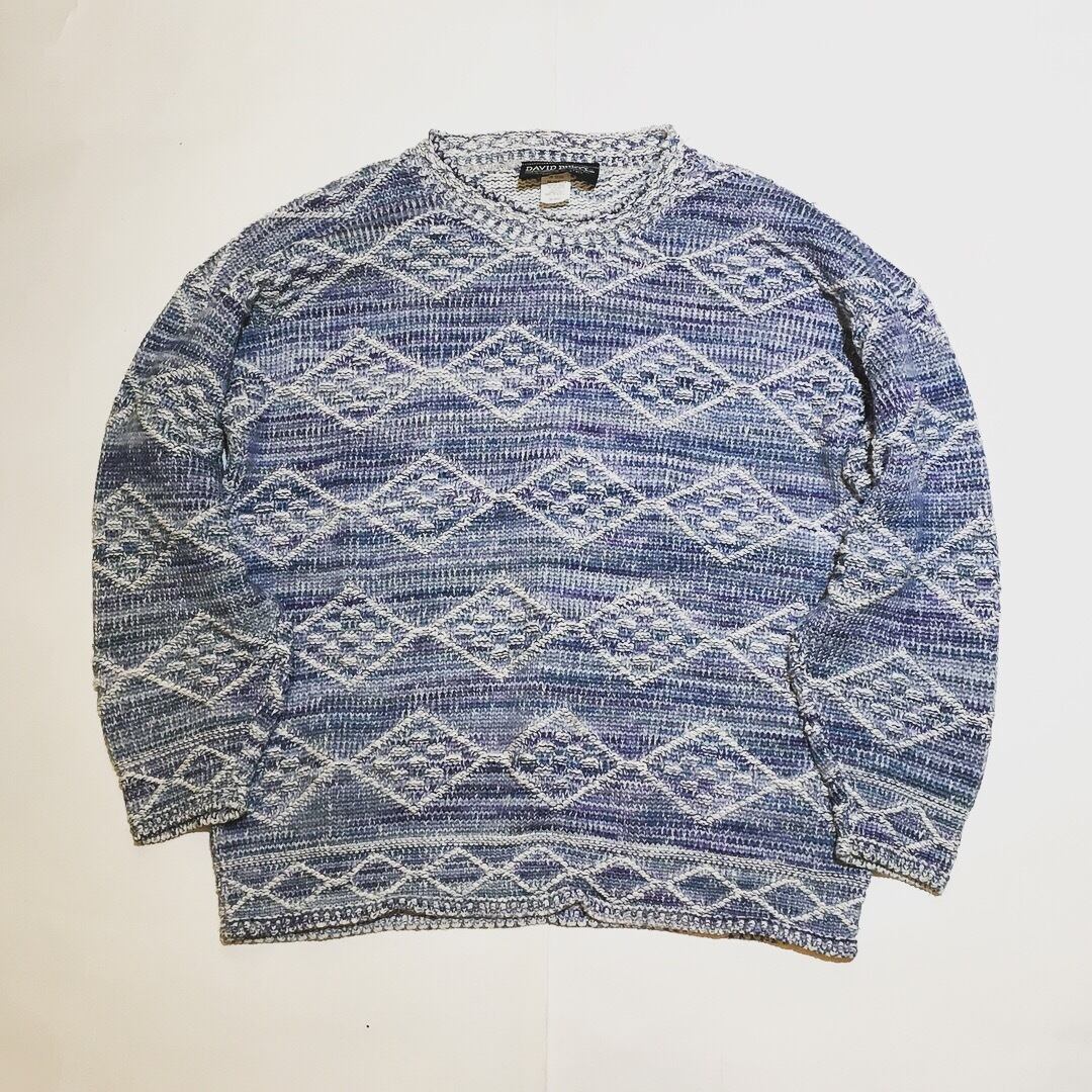 ユニークな柄が全体に広がるコットンニットです。ポリエステル混の為、コットンのみのニットにはない光沢感ある表情も良いですね。アメリカ製というところ嬉しいポイントです。春に向けてカットソー感覚で着て頂けるアイテムです。