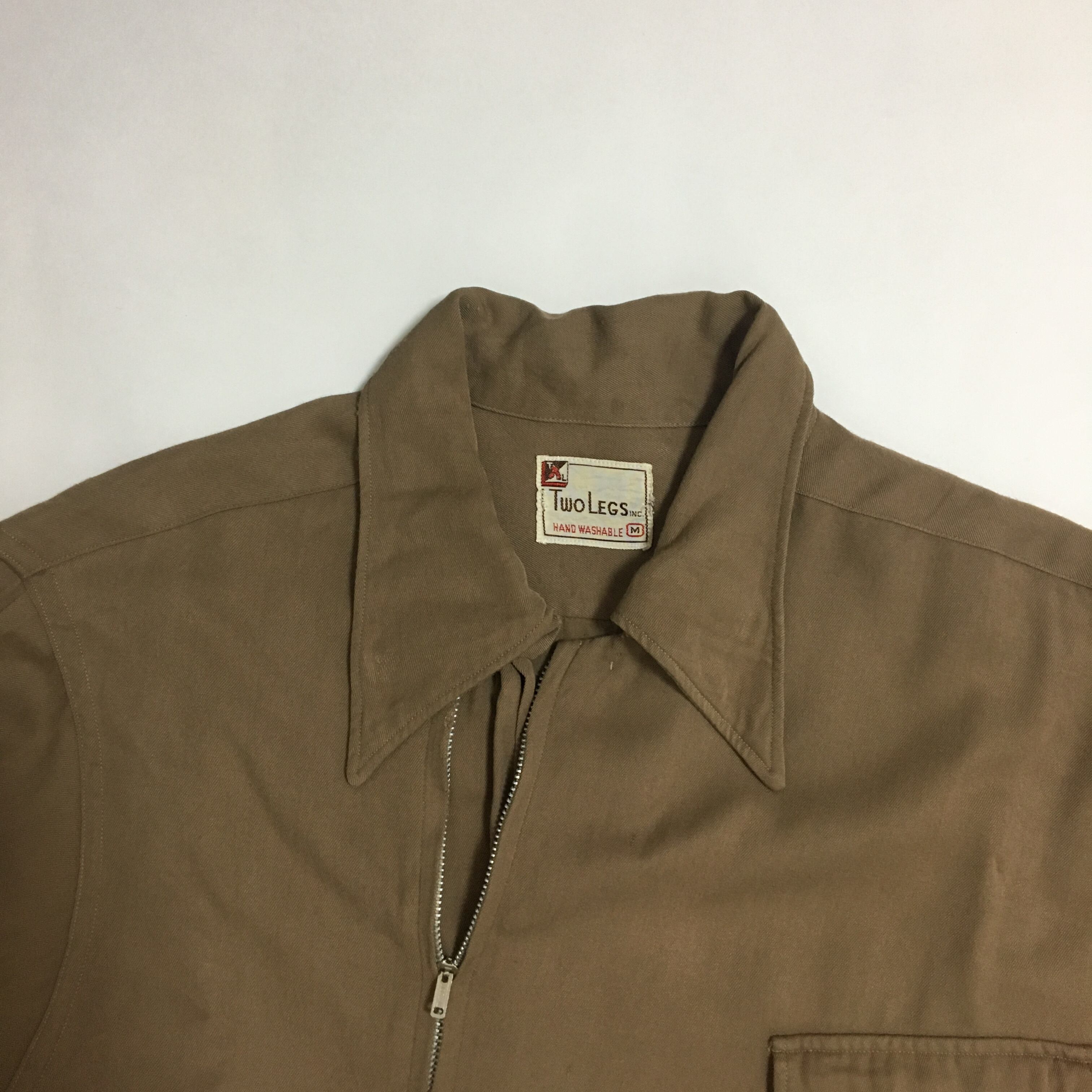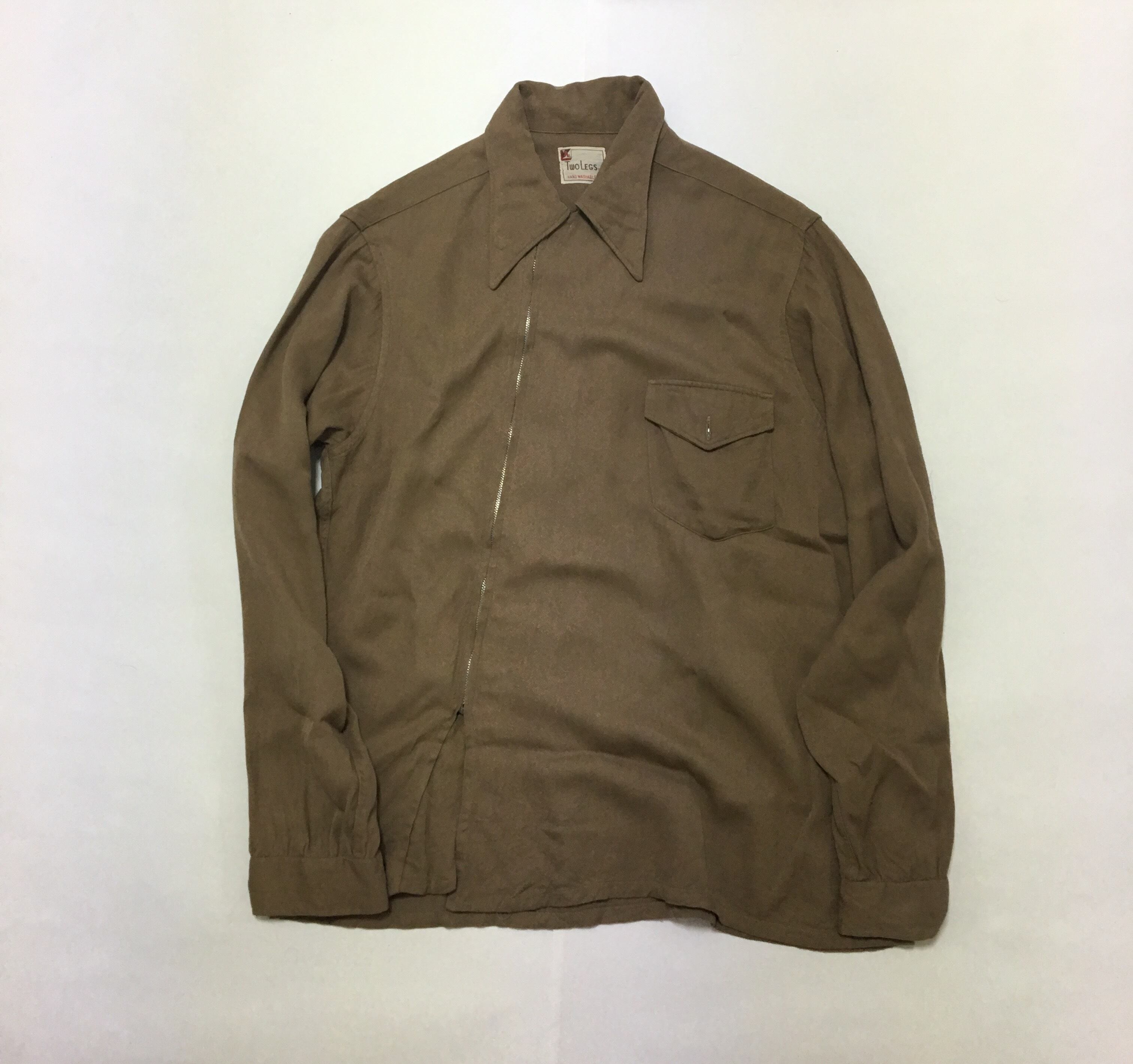 50年代と思われる、ジッパーが斜めに付いたレーヨンシャツです。ボタンではなくジッパーで、斜めに付いているという珍しいディテールに目を惹かれますね。モカブラウンというカラーでしょうか。古着らしい配色で、シャツジャケットのようです。ジッパーは閉めずにざっくりと羽織って頂きたいアイテムです。