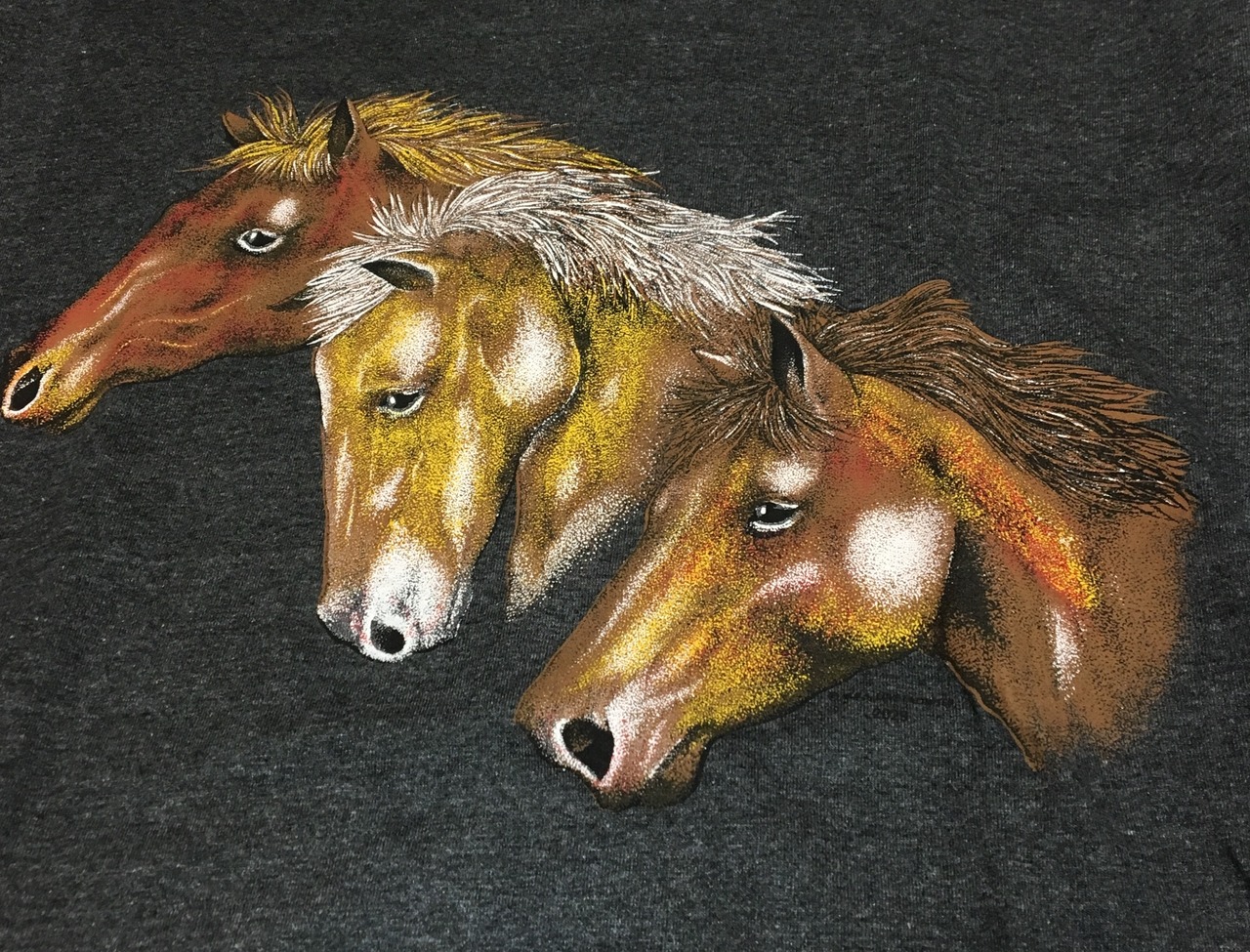 3頭の馬のプリントがインパクトあるプリントTシャツです。ボディの色は、濃いチャコールグレーの霜降りというところも良いですね。コットンとポリエステルのミックスで、生地感はがっしっとした肌触りではなく、やわらかくしなやかな生地感です。