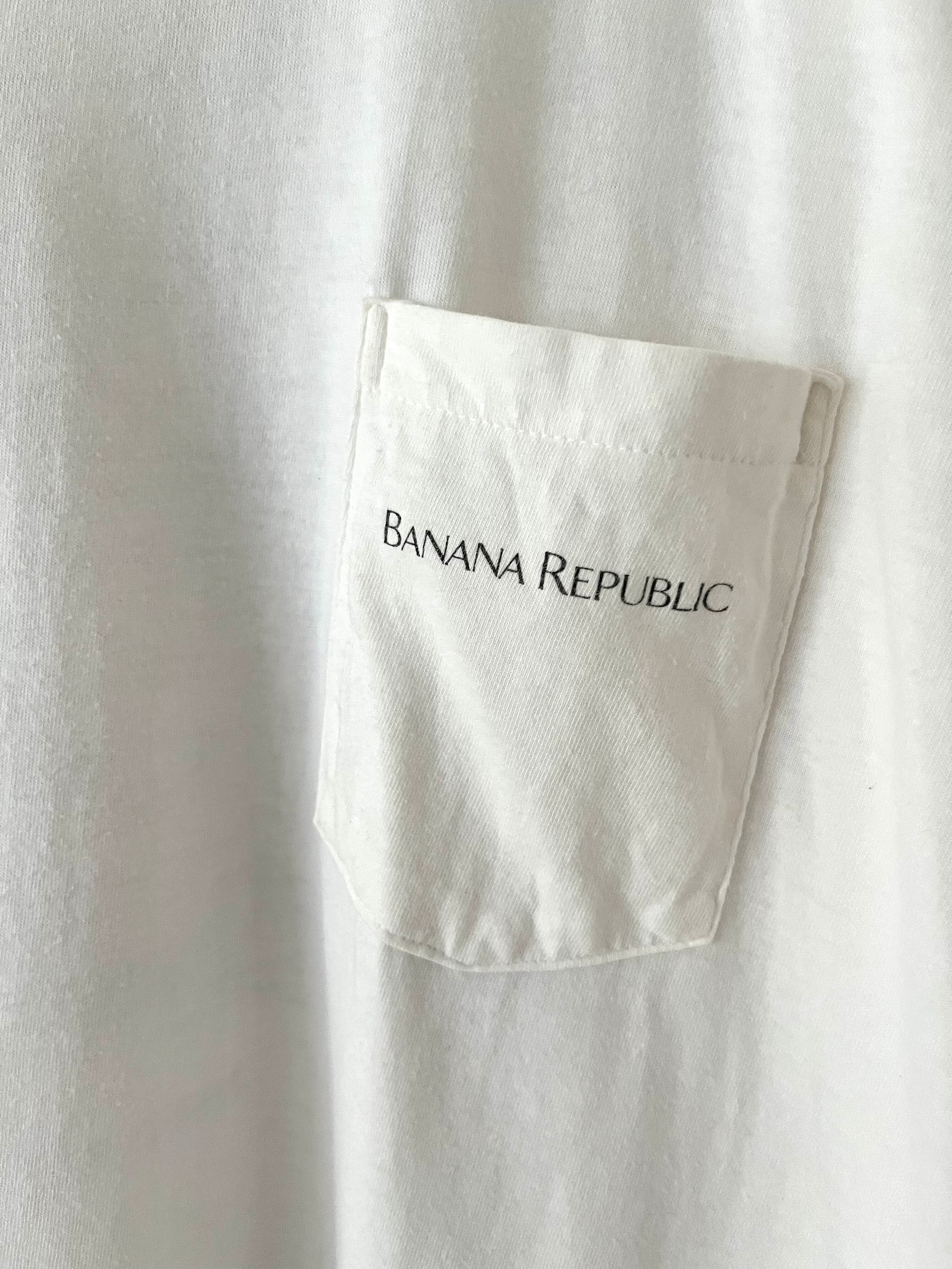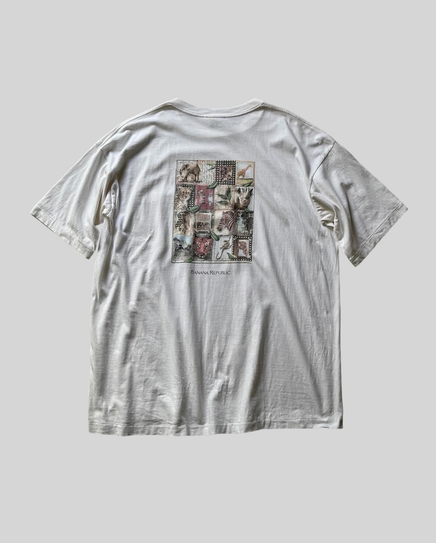 90年代のバナナリパブリックのポケットTシャツです。バックプリントには、動物達が描かれたアニマルモチーフ。