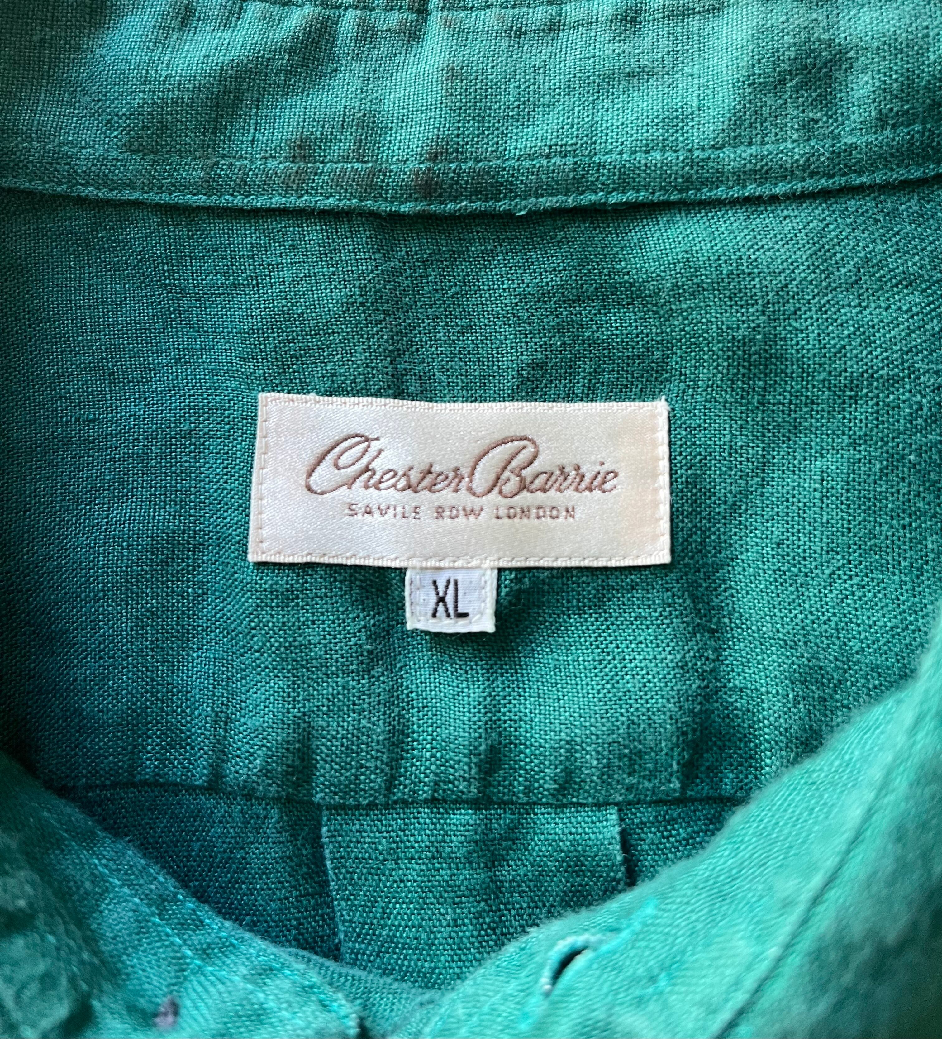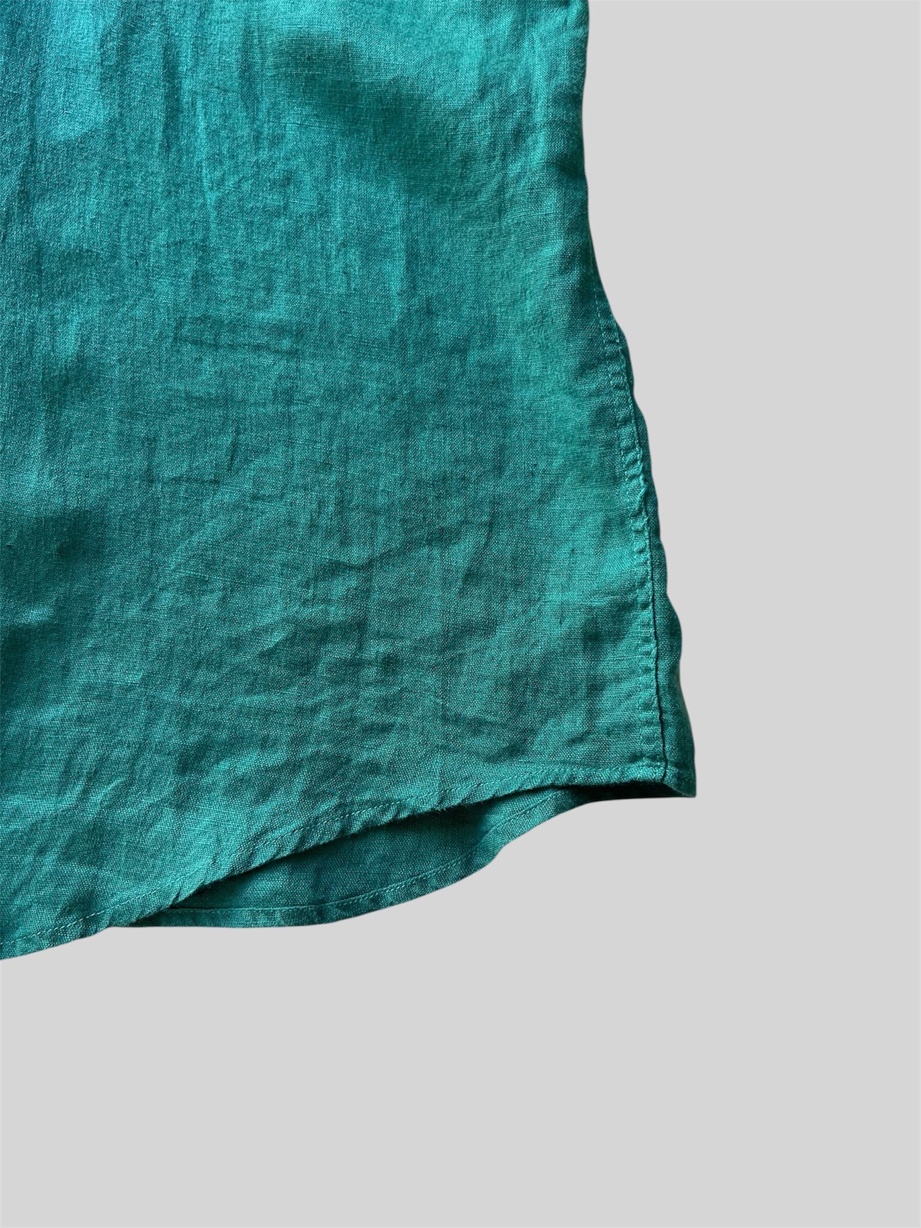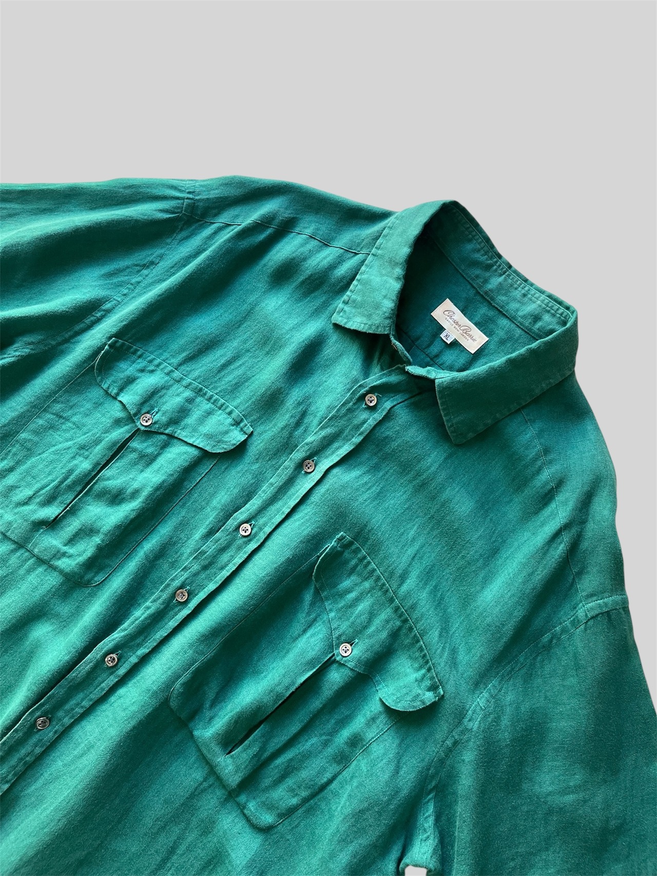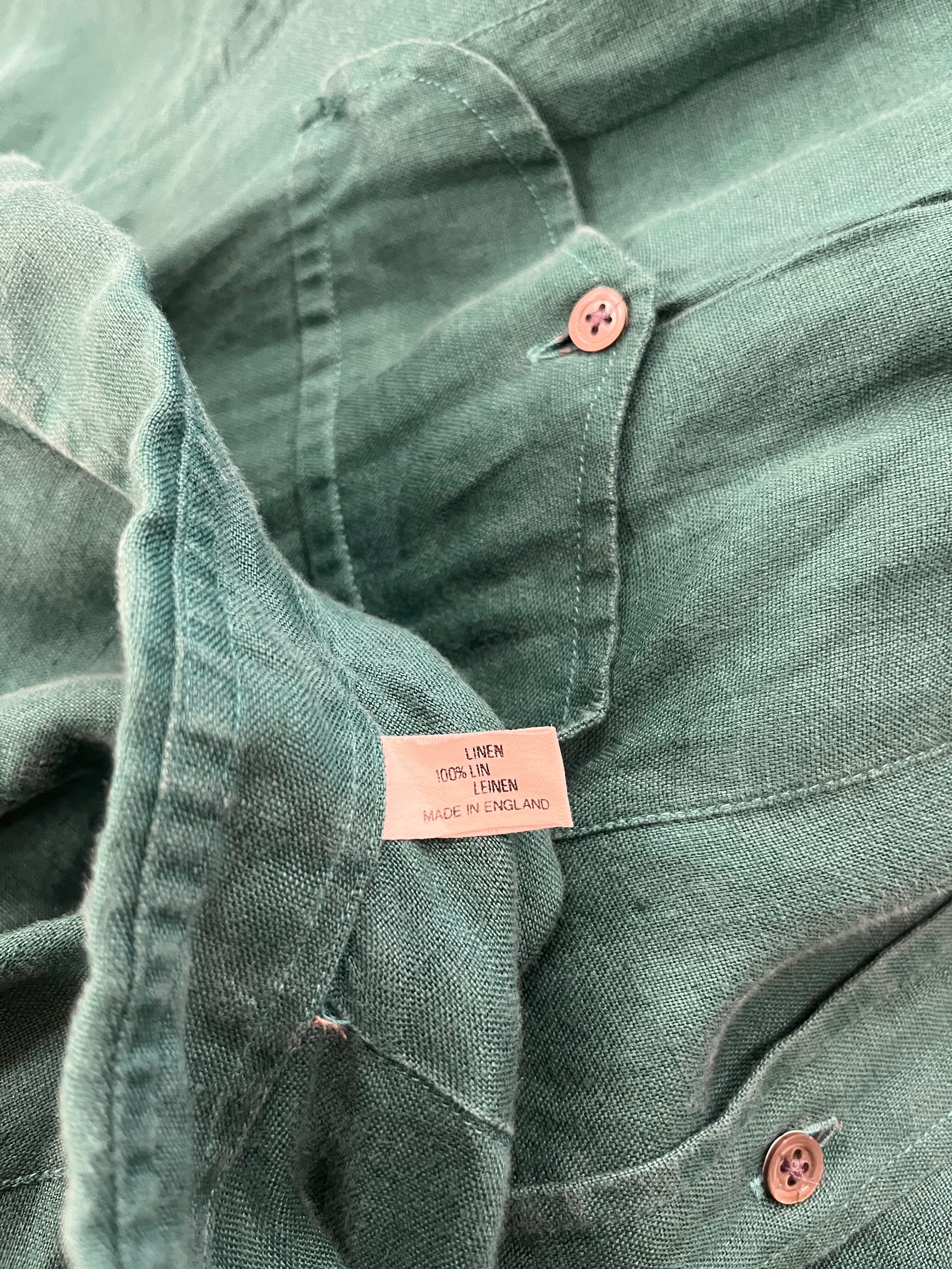 ダークグリーンの深みあるカラーリングのシャツです。ざらつくリネンではなく、しっとりとした肌触りの、上質なオールリネン