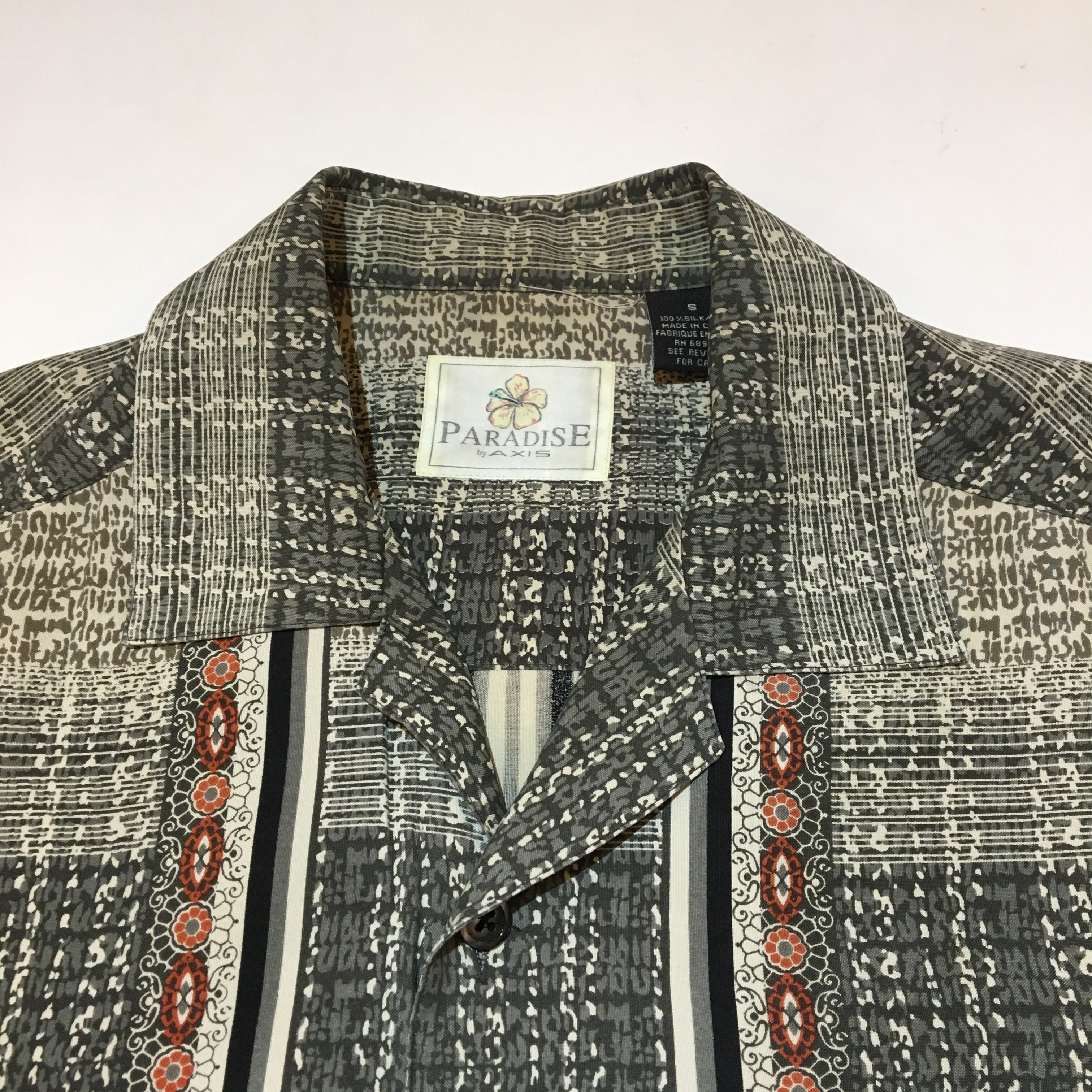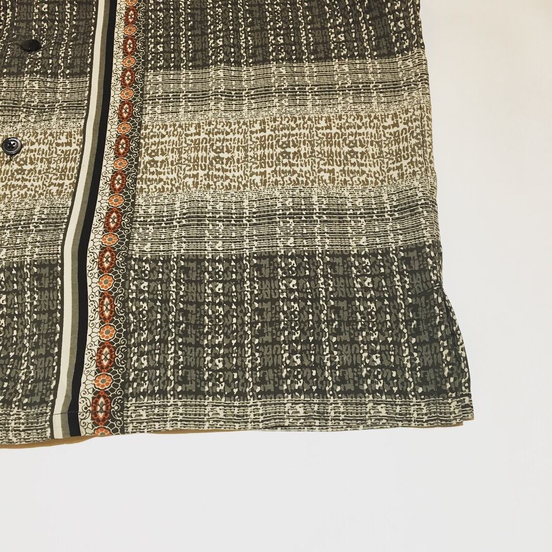 落ち着いた柄が印象的な1枚です。オープンカラーで羽織りに使いやすいかと思っております。肌触りがつやつやしたシルクではなく、マットな質感の硬いシルクを使用した1枚です。