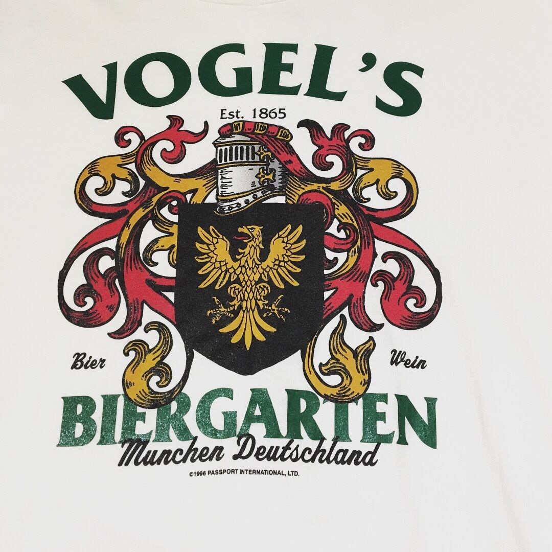 ドイツ語でビアガーデン。フォーゲルスとプリントされたTシャツです。高く位置どるプリントのバランス、カラーリングも秀逸な1枚です。96年に行われた、ミュンヘンでの、ビールフェスなのでしょうか。古着のビールTシャツかっこ良いもの多いですね。ホワイトボディの為使いやすいはずです。