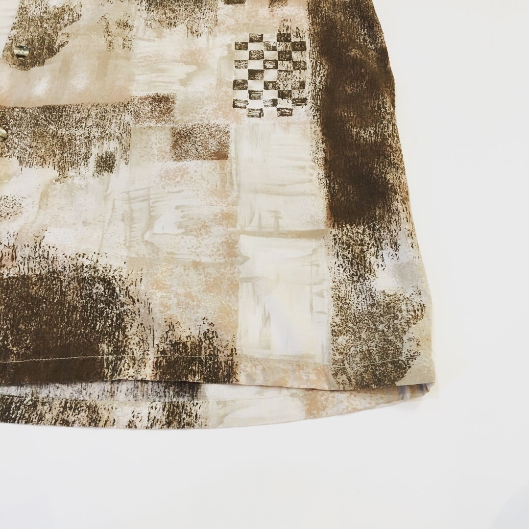 抽象的な柄と言うのでしょうか。なんとも言えない柄が良い雰囲気ですね。オールコットンですが、レーヨンのような柔らかい質感です。所々消えそうなプリントも素敵な1枚です。小さく主張しない襟も着やすいポイントかと思います。