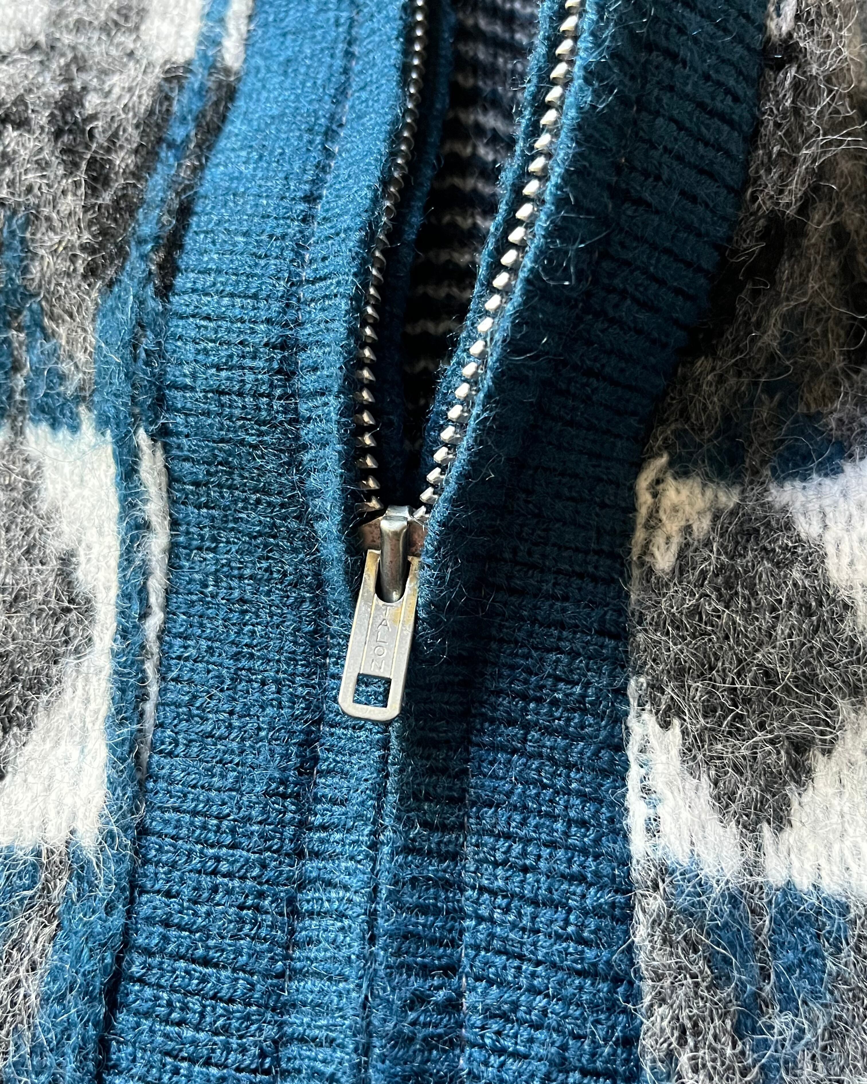 モヘアのように毛足の長さがモヘアを感じさせてますね。高さある襟、配色、柄ともに非常に良いです