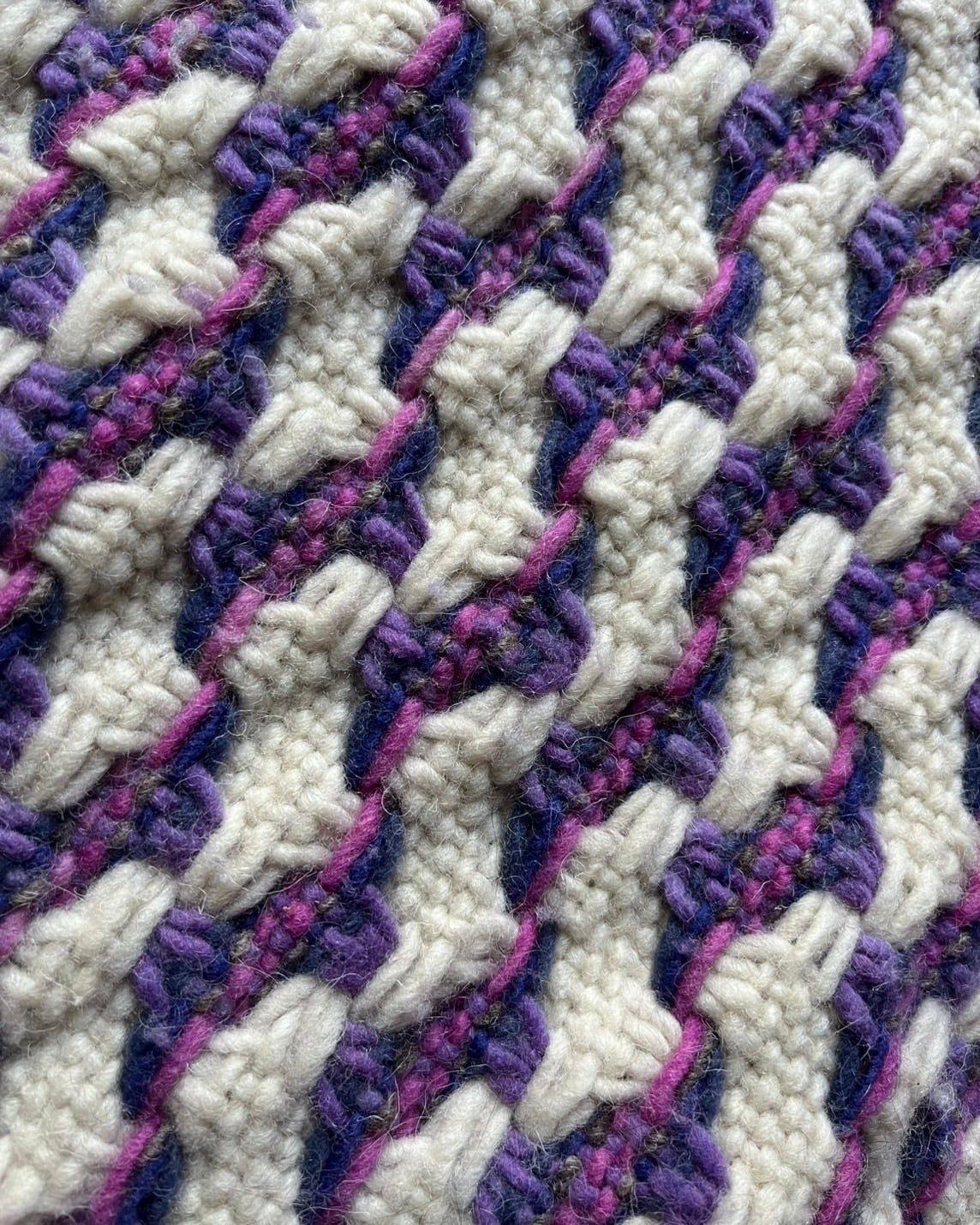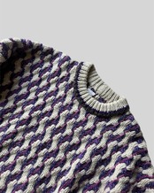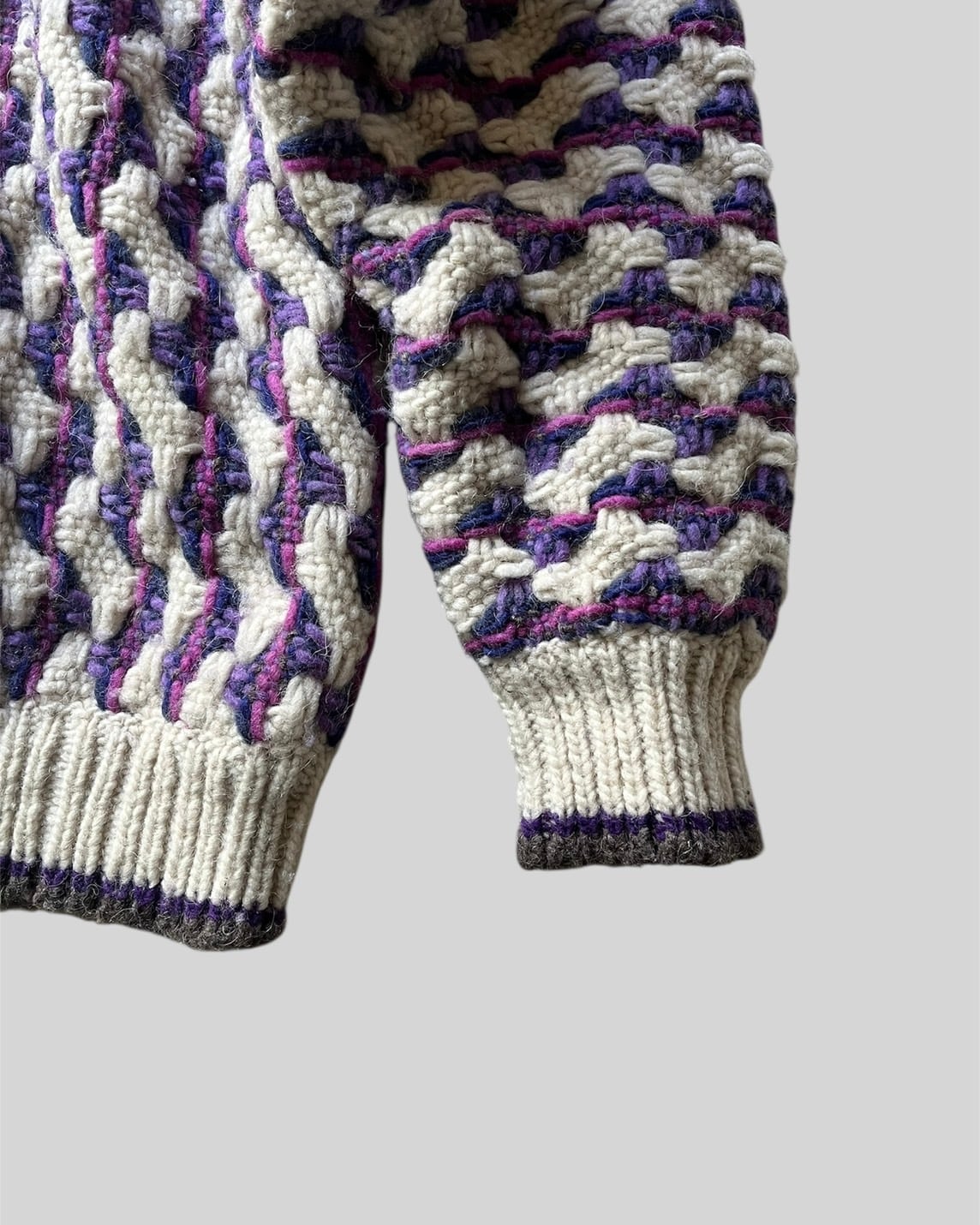 パープル、ピンクの奥行きある編み目、ずっしりと分厚いウールでカウチンセーターのよう