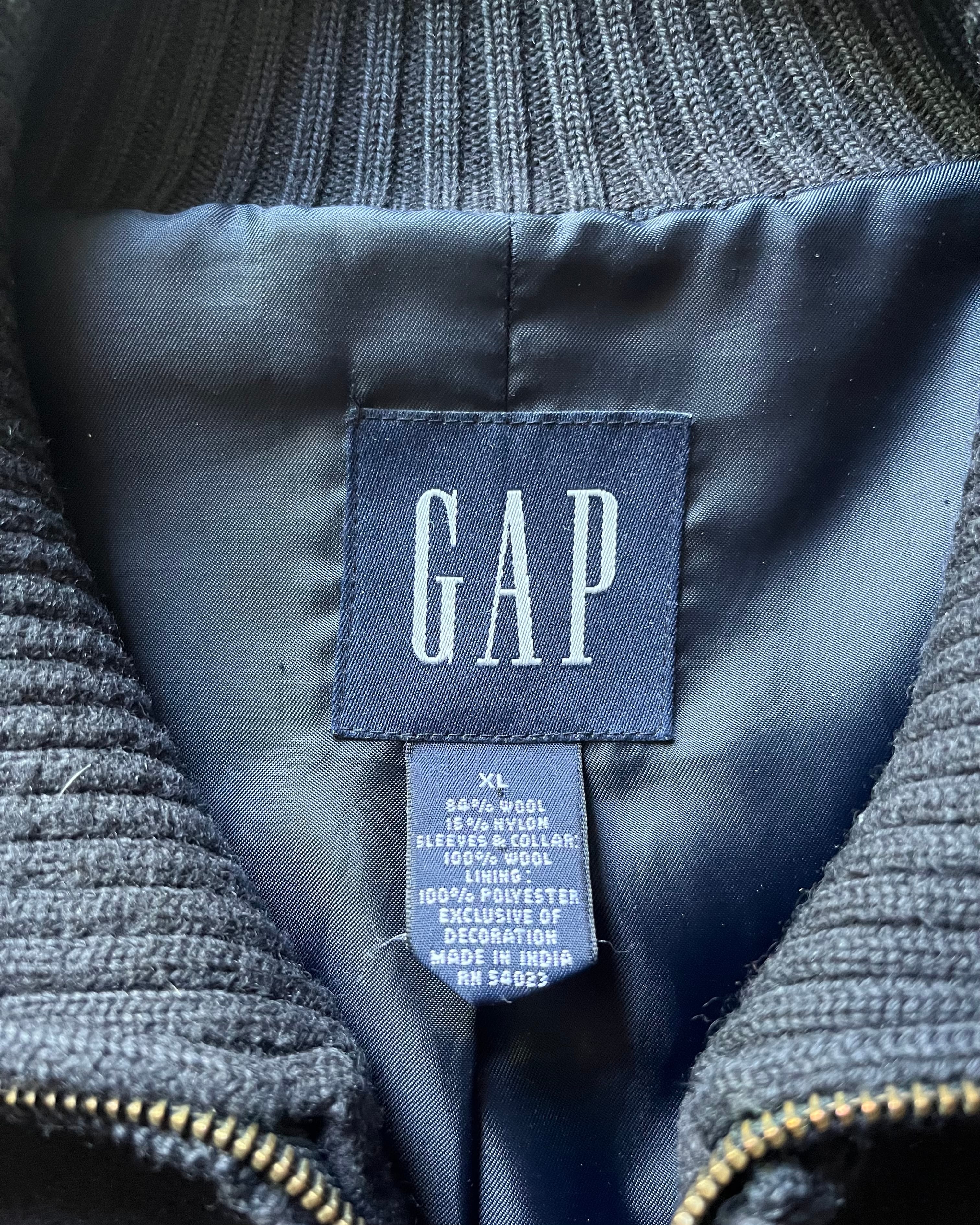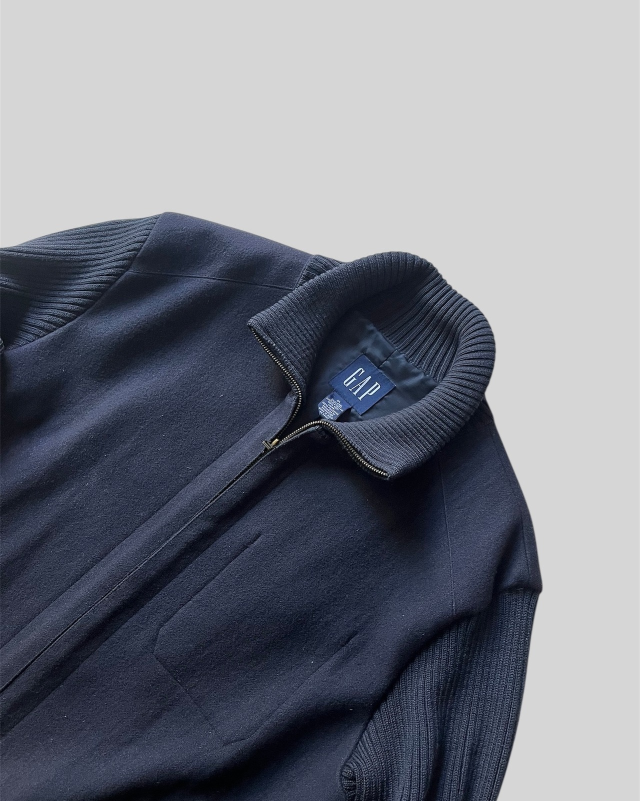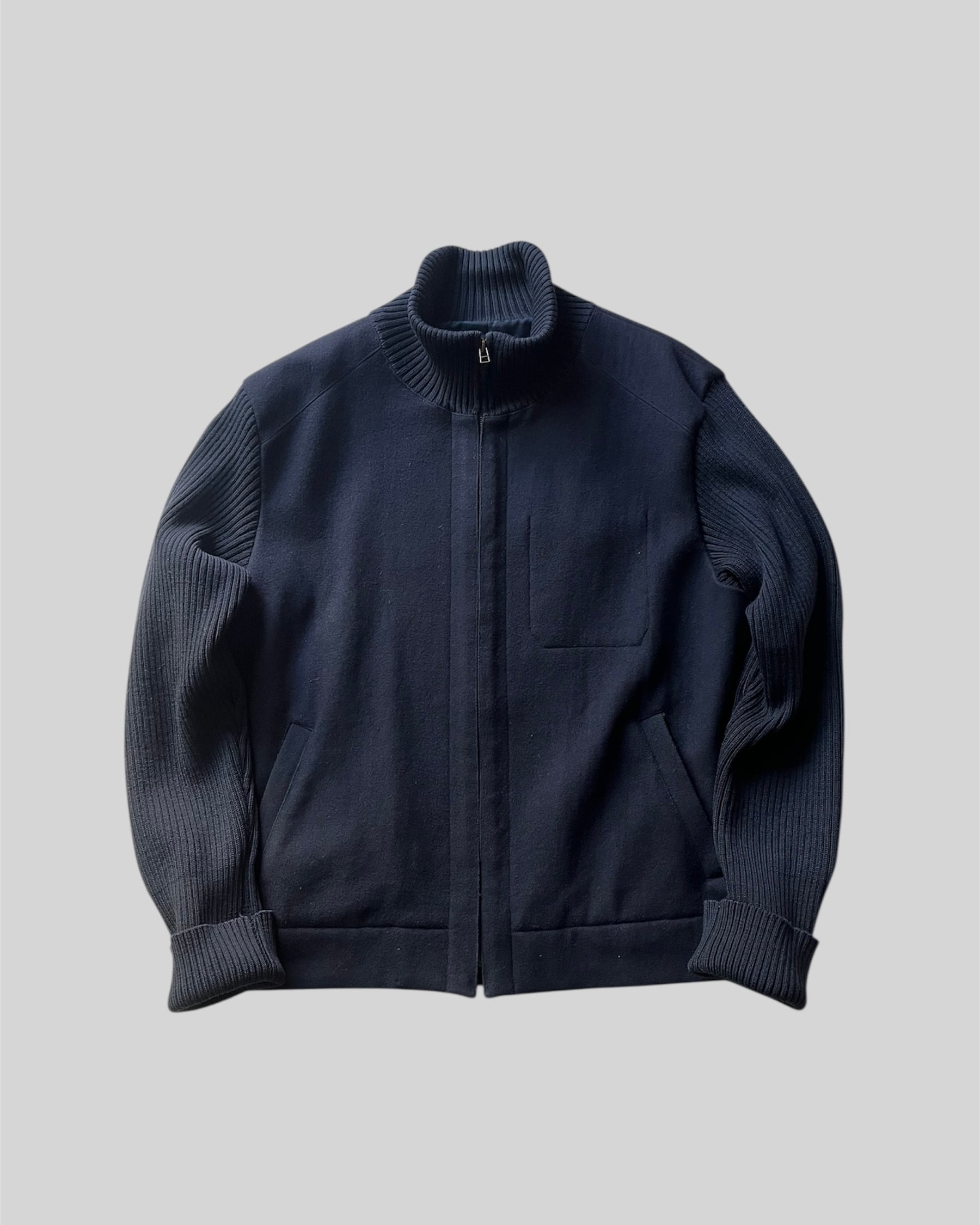 ダークネイビーのウール地に、袖部分はニットの切り替えが秀逸ですね。アウターとニットのいいとこ取りな1枚です