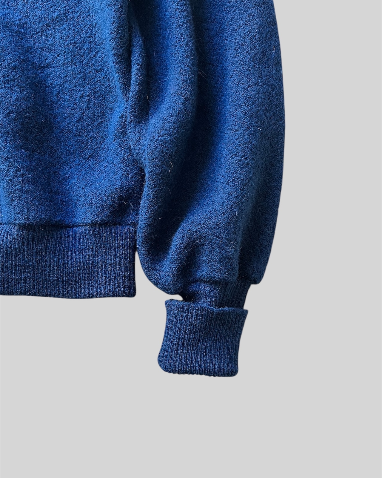 綺麗なブルーでウール、アルパカで化学繊維なし。肌触りも良く、しなやかな生地感です