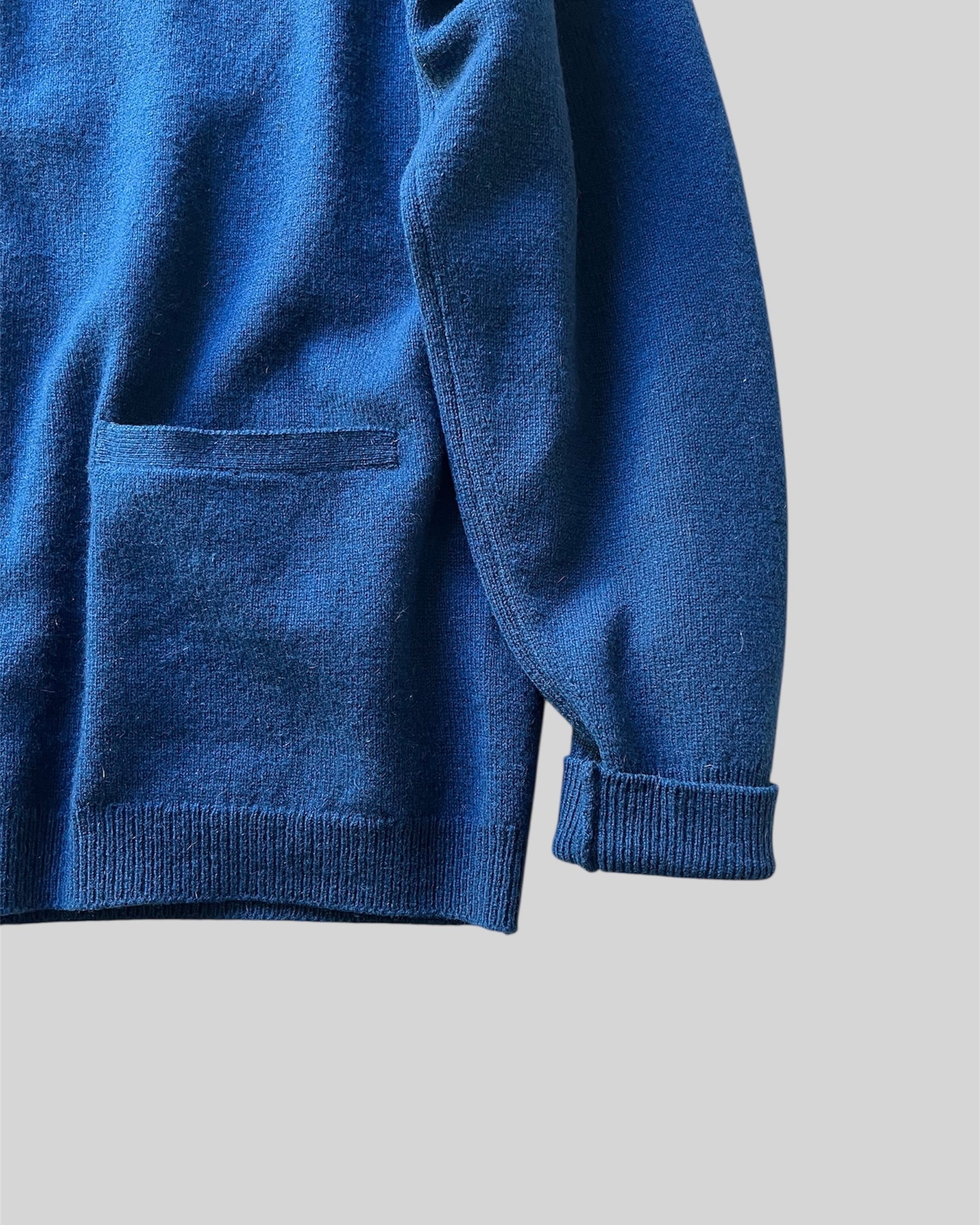 青く綺麗な色味、柔らかくしなやかなラムウールで着心地も良いです