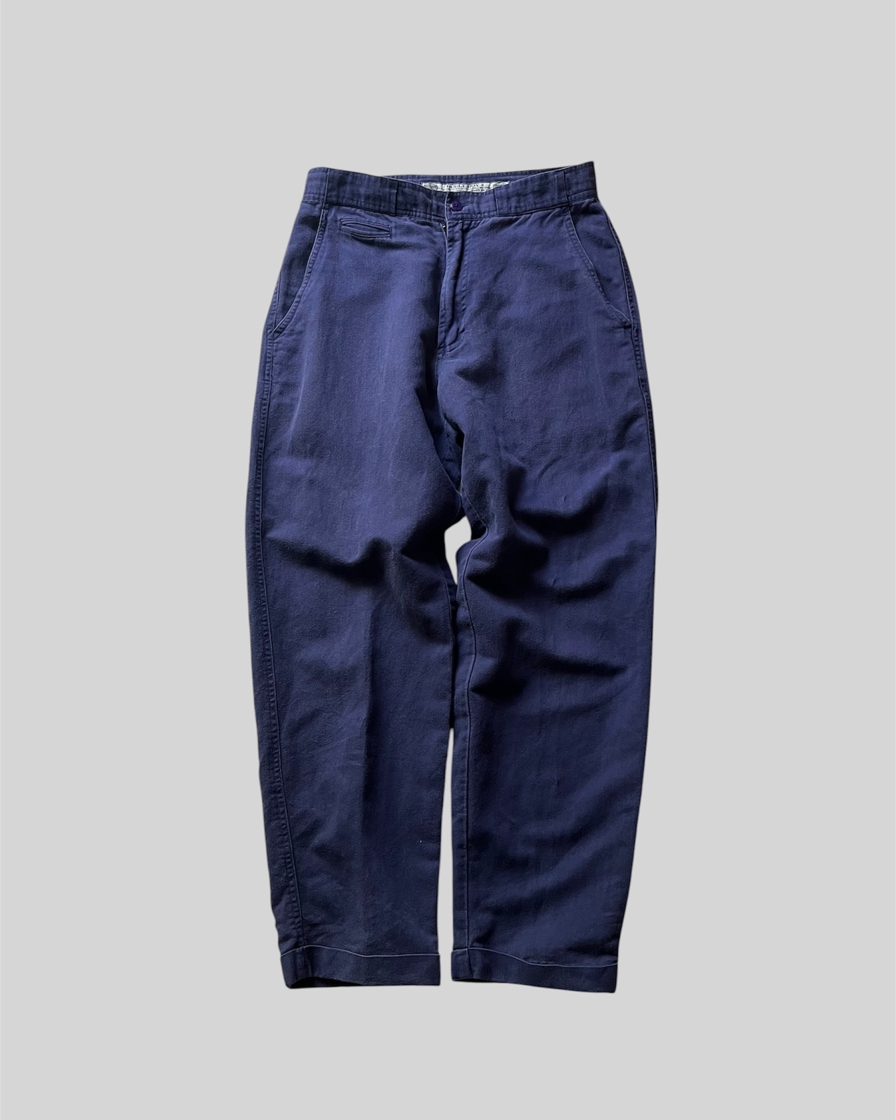 フランスのワークパンツのような茄子紺、いい色してますね。起毛した生地感の風合いも楽しめます