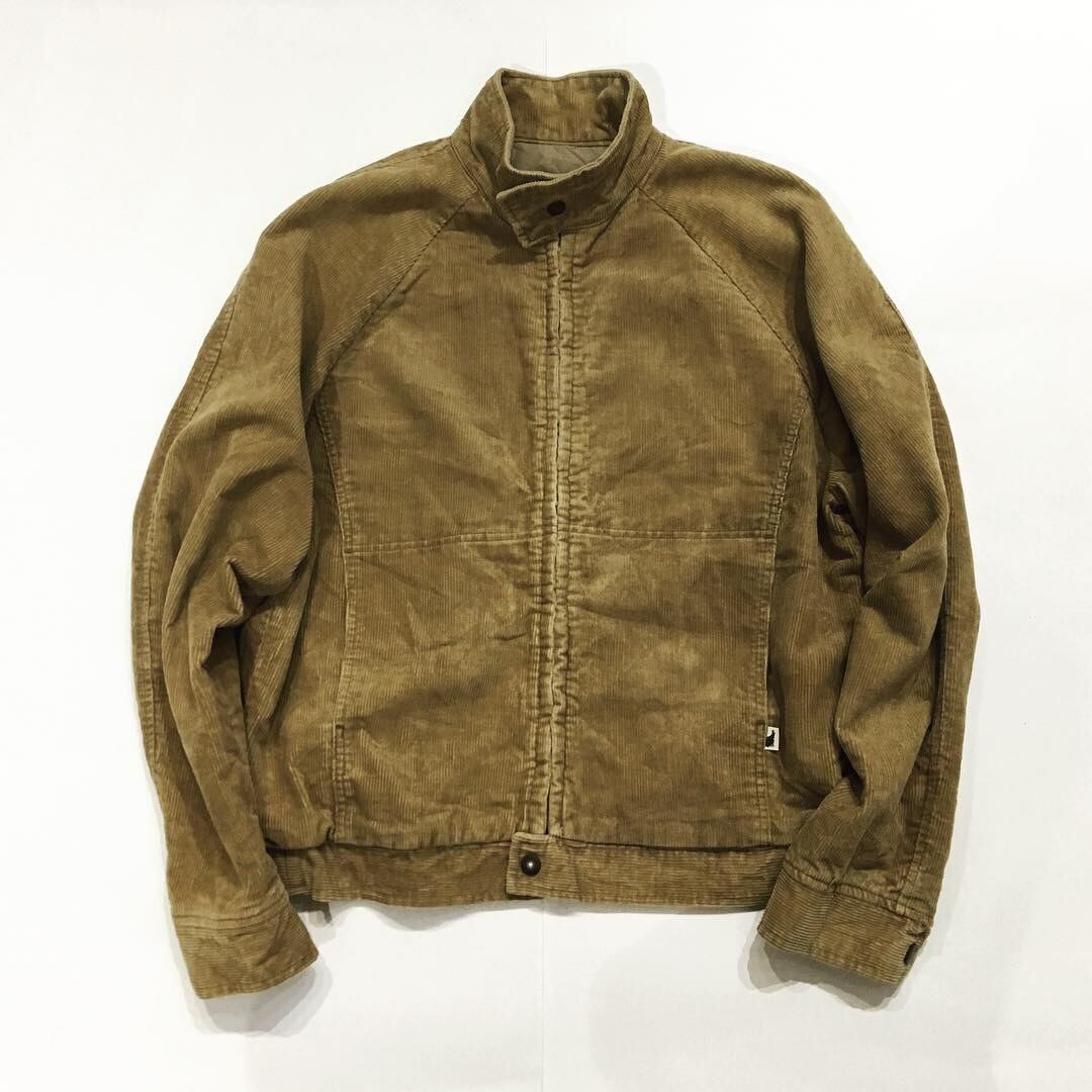 濃いベージュのコーデュロイジップアップブルゾンです。ジップを隠す、ディテールがシンプルさを際立たせております。立ち上がるネックも面白いですね。秋口からのライトアウターとして使って頂けると思います。裏地にナイロンが使用されており、ニットなどを着た際にも、レイヤードしやすいところもおすすめです。