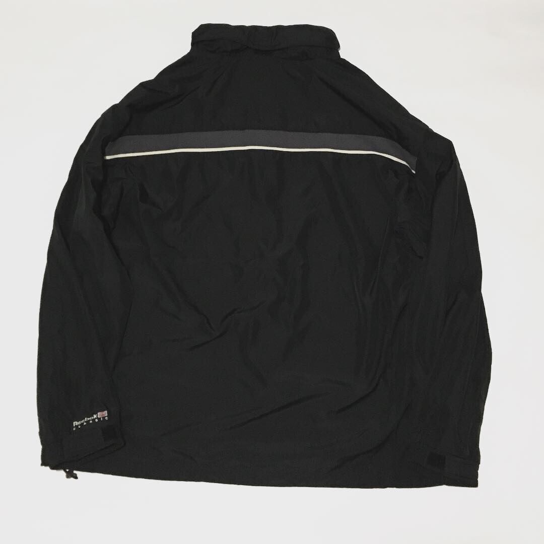 光沢の感のあるリーボッククラッシックのジップアップジャケットです。無駄のないシンプルな作りが、素敵な1枚です。左袖の刺繍や後ろにラインが入っており、アクセントになっております。フードが襟の後ろ部分に閉まって頂けます。