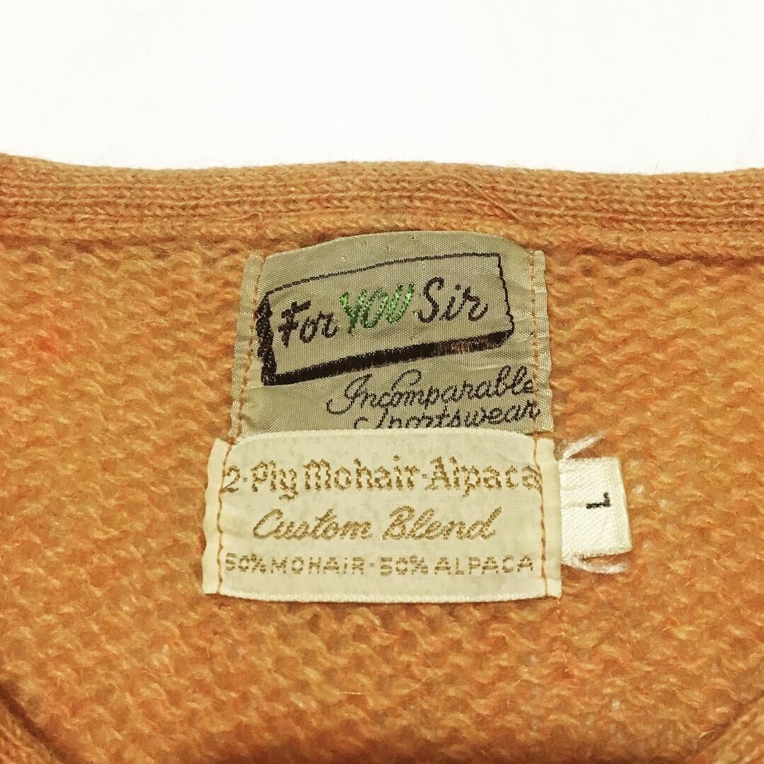 60年代と思われるモヘア、アルパカのプルオーバーニットです。綺麗なオレンジが目を引きますね。化学繊維なしというところも、素晴らしい。ここ近年高騰しているモヘアニットに、アルパカブレンド言うことなしかと思います。アウターの中に色で遊べる1枚。
