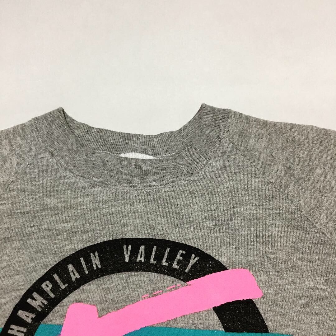 アメリカ、バーモント州キャンプレインバレーファアーのプリントスウェット。霜降りグレーのボディに、カラフルなプリントが目を惹きますね。アメリカ製とタグもフルーツオブザルームということなしな1枚な気がしております。裏起毛タイプで、少し肌寒い夜などに、最適ではないでしょうか。