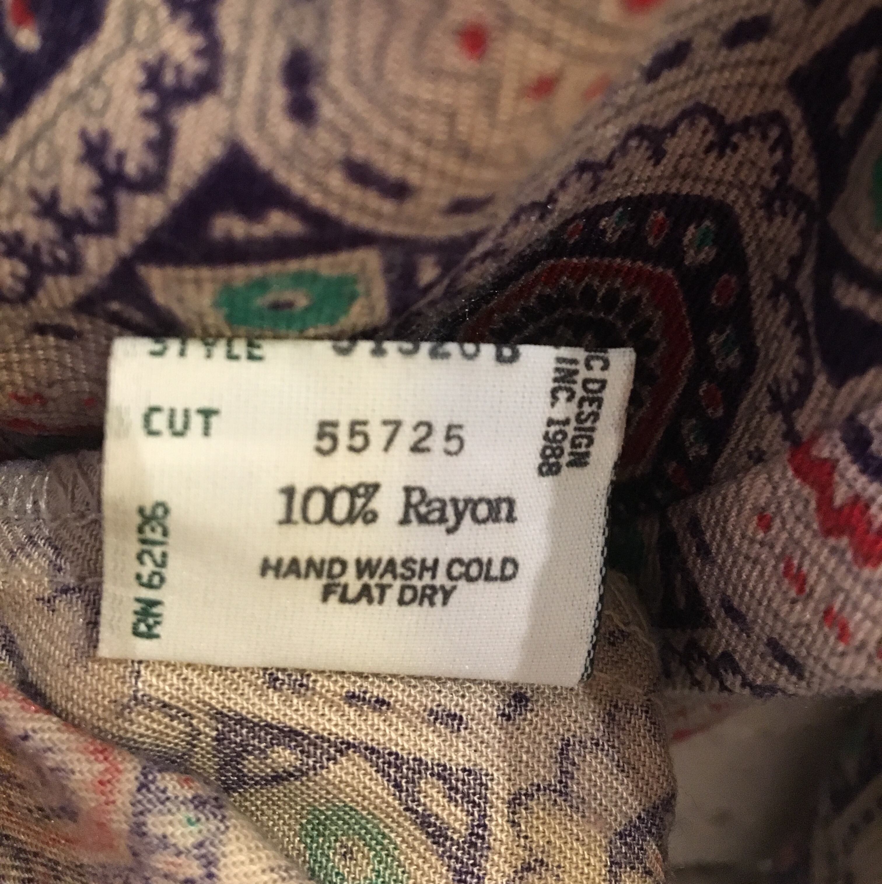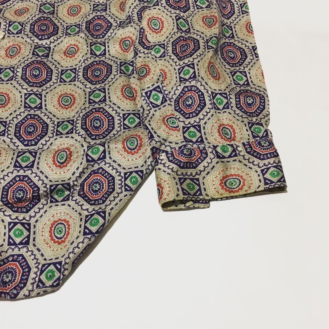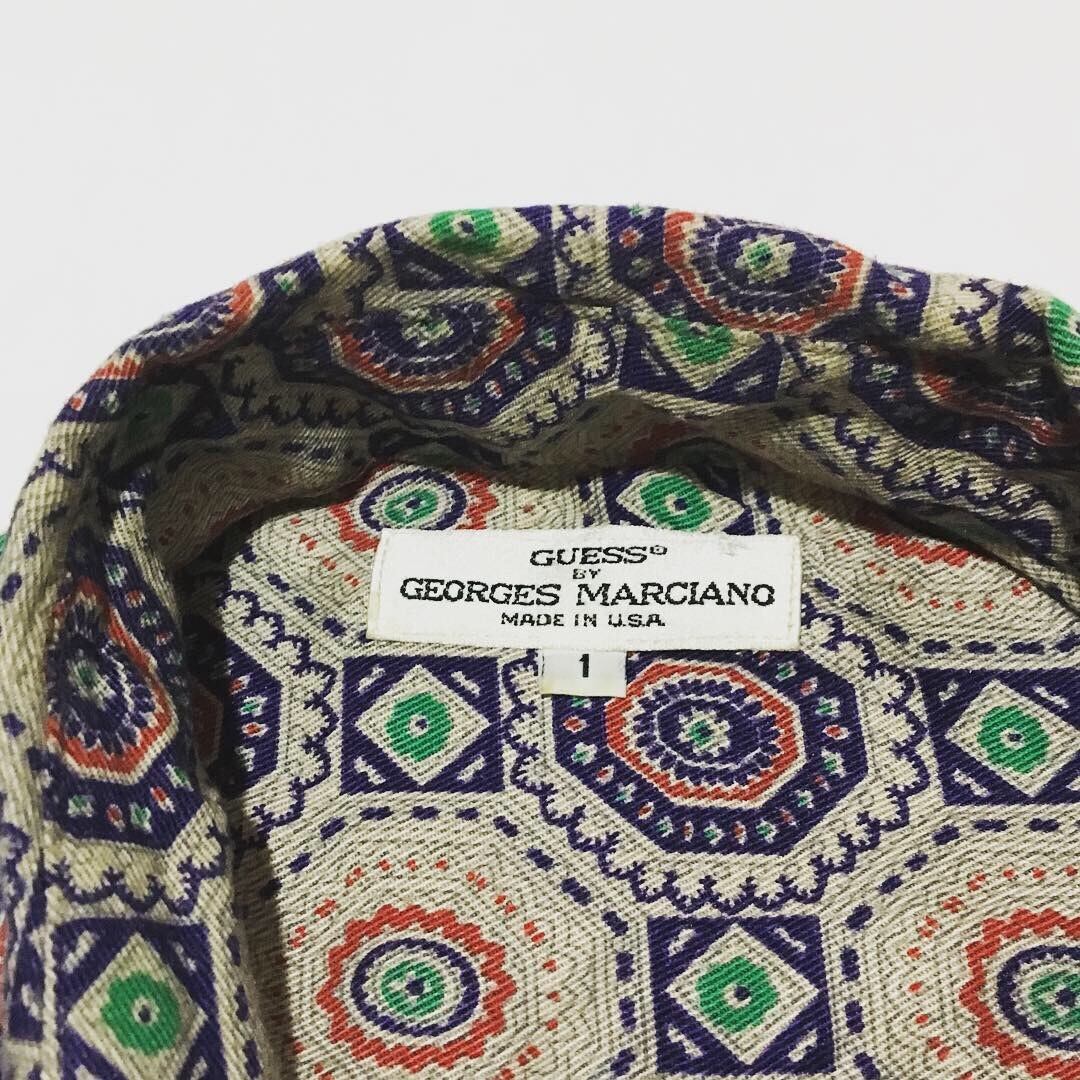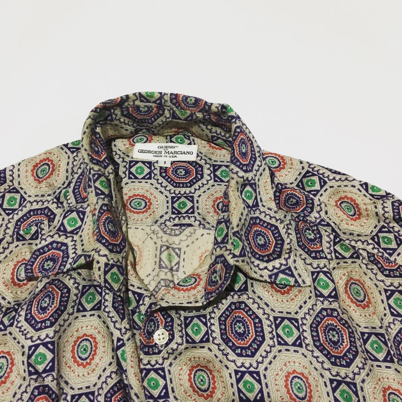 個性的な柄が全体に広がったレーヨンロングスリーブシャツ。80年代に生まれたアメリカのゲスというブランドのものです。てろっとした質感で着て頂くと、レーヨンならではの柔らかい着心地を楽しんで頂ける1枚ではないでしょうか。春先の羽織として使って頂けます。
