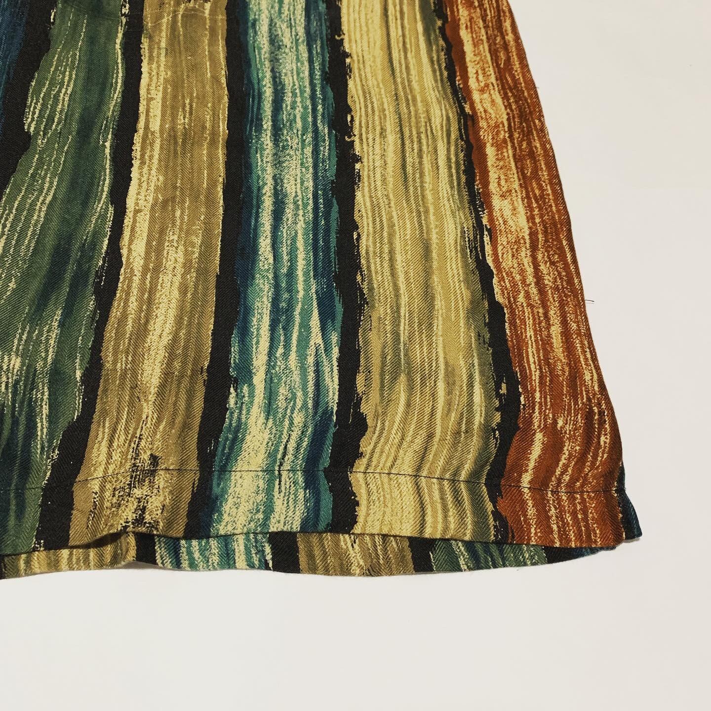 流れるような柄が印象的なシルクシャツです。派手過ぎずな落ちついたカラーリングで、コーディネートに使いやすいかと思います。サイズは XXLですが、スリットの入ったボックスシルエットで着丈はすっきりとしております。適度な重みのあるシルク生地で、真夏に活躍してくれるはずです。