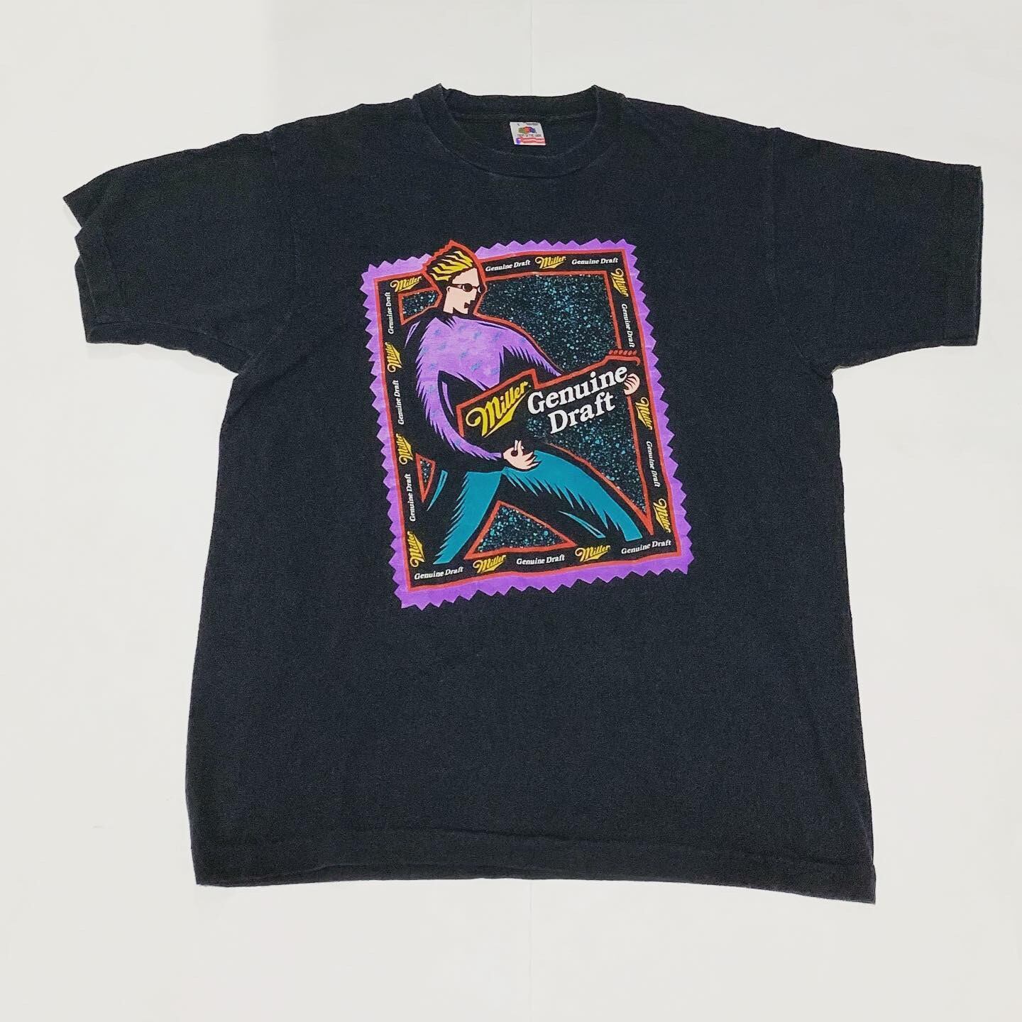 アメリカのミラードラフトジェニュインビールのプリントTシャツ。90年代と思われる、フルーツオブザルームのボディーを使用しております。プリント、カラーリングともに良いですね。ミラードラフトのキャラクターなのか。とてもユニークな1枚です。