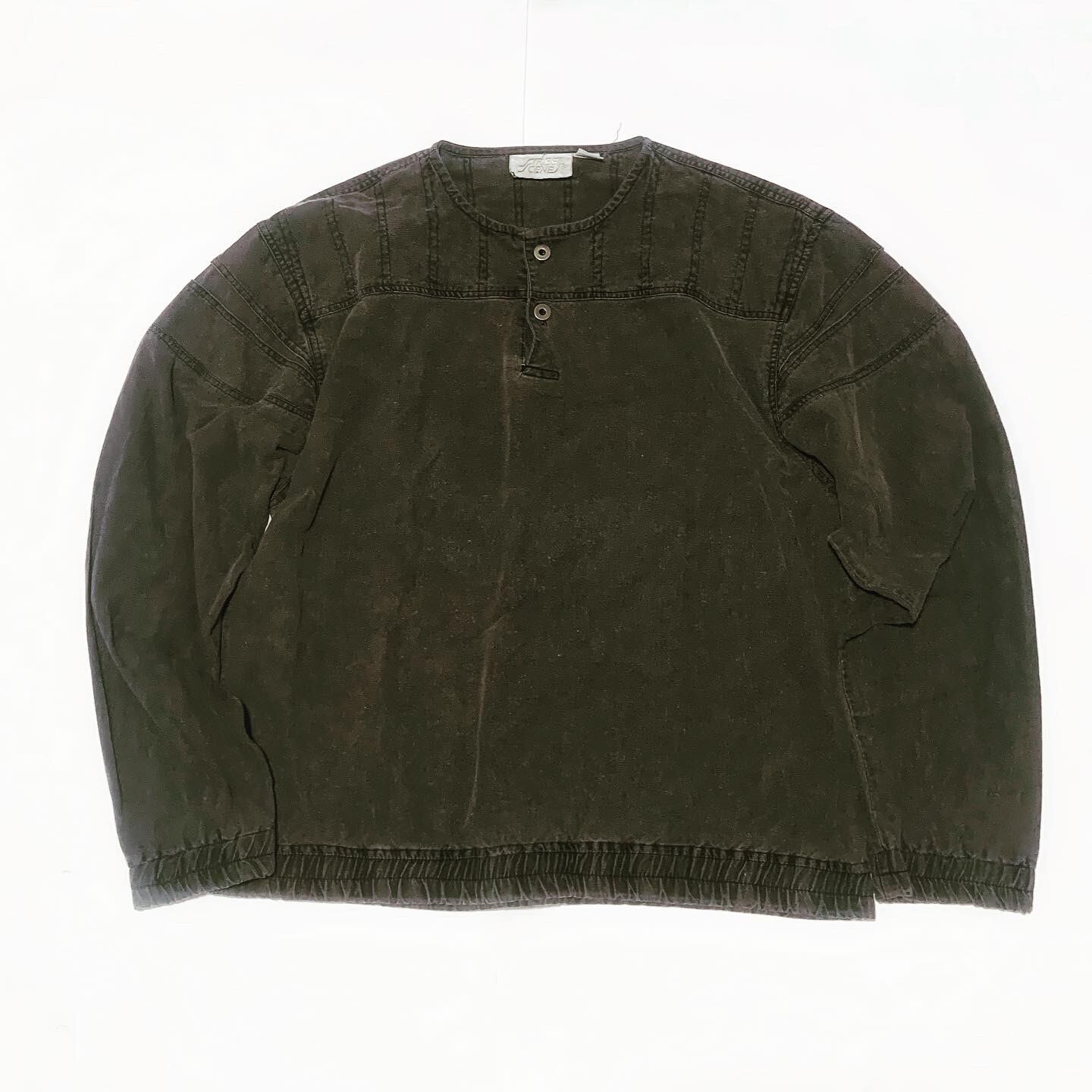 胸元から肩口にかけての多彩なステッチが印象的なコットンプルオーバーシャツ。フェードブラックが格好良いですね。首元はすっきりとしており、身幅は広く着丈は短い作りになっております。裾のリブの詰まりもなくカットソーや、シャツの上からレイヤードも楽しめます。