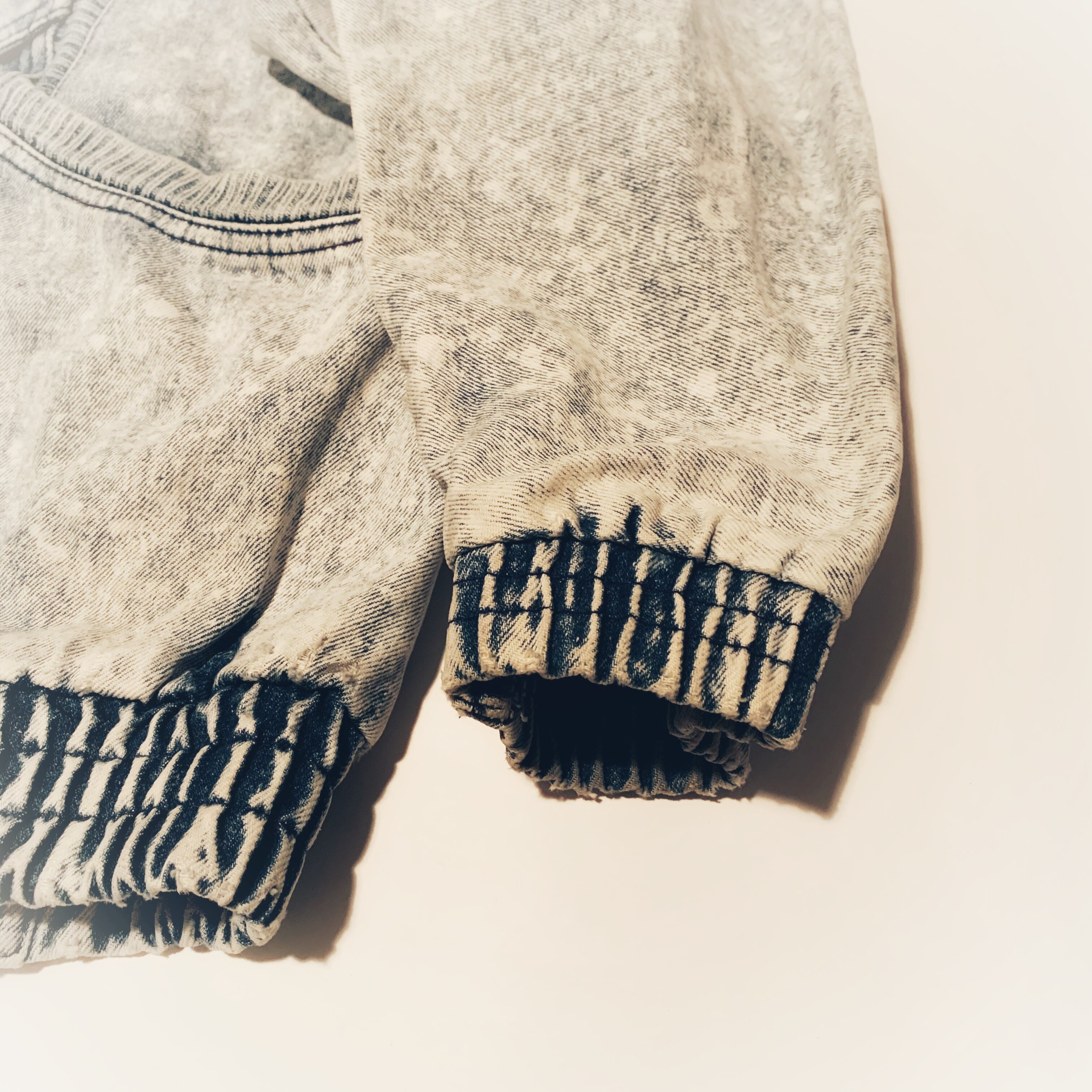 メリハリある綺麗な、ケミカルウォッシュが印象的なデニムブルゾンです。肩部分などに見られるリブの切り替えが、とてもユニークな1枚です。身幅、アームホームなどはゆったりとした作りで、レイヤードも楽しんで頂けます。