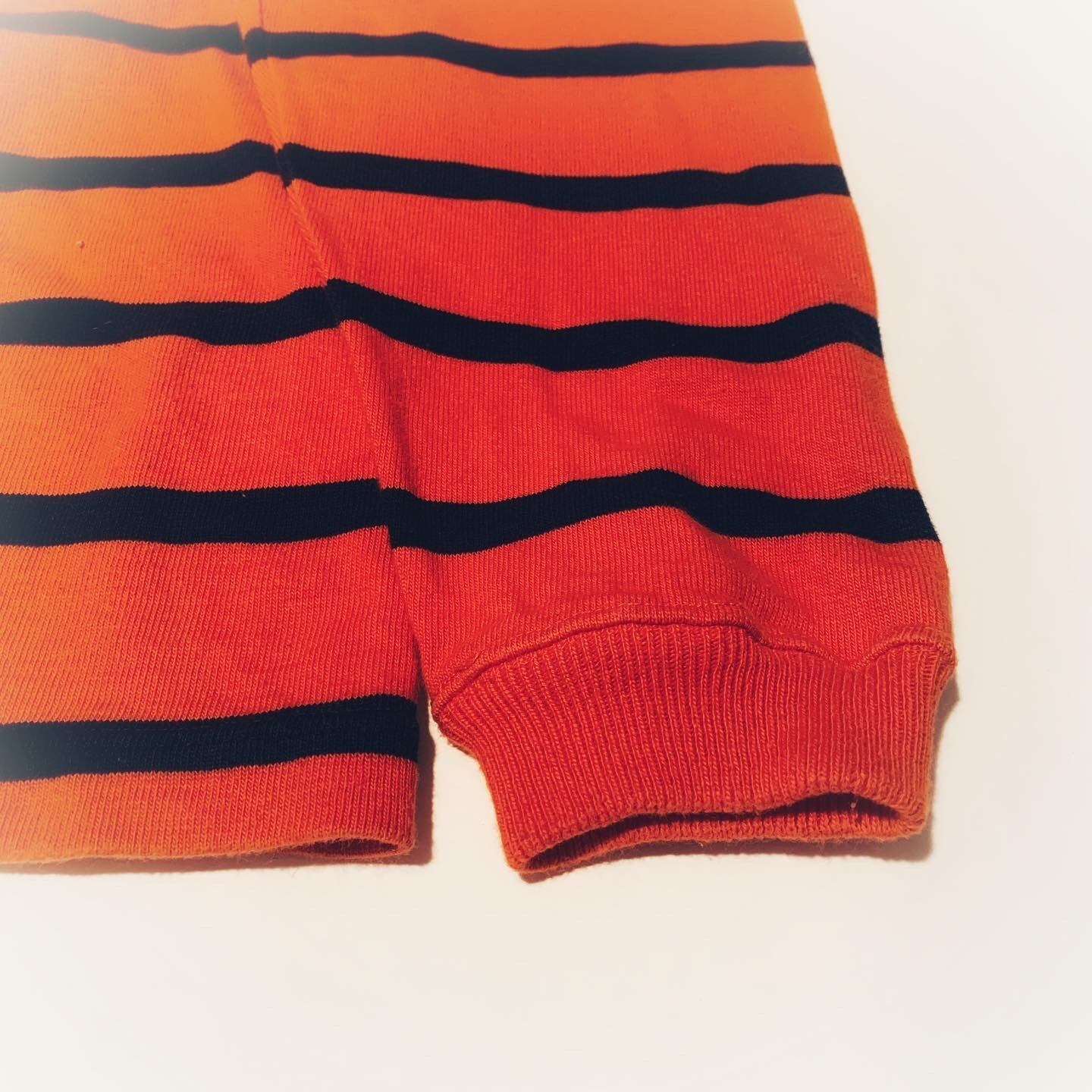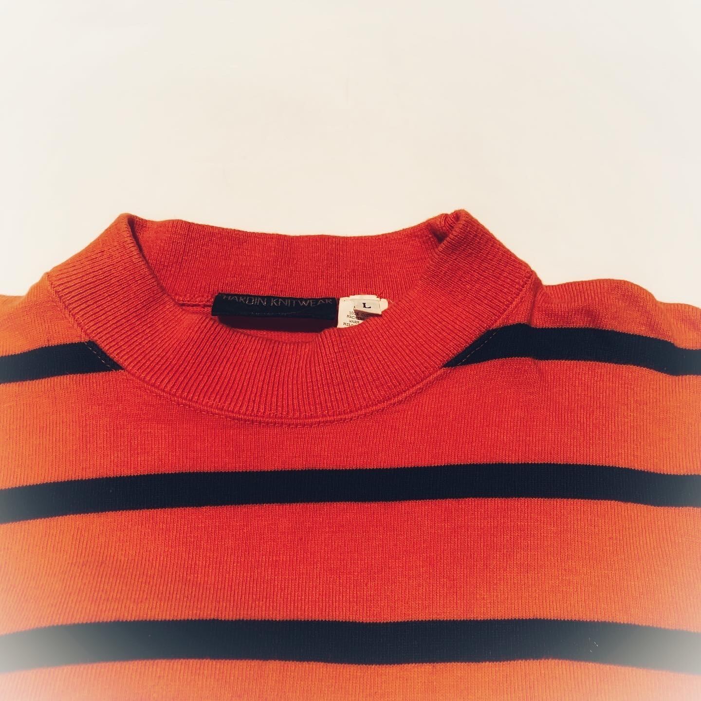 発色の強く、綺麗なオレンジが印象的なニットカットソーです。立ち上がるモックネックもいいですね。コットンのちょうど良い厚みな生地感かと思います。ニットとカットソーの中間くらいかと思われます。インナーで使っても良し、春先や秋口は1枚でも重宝します。
