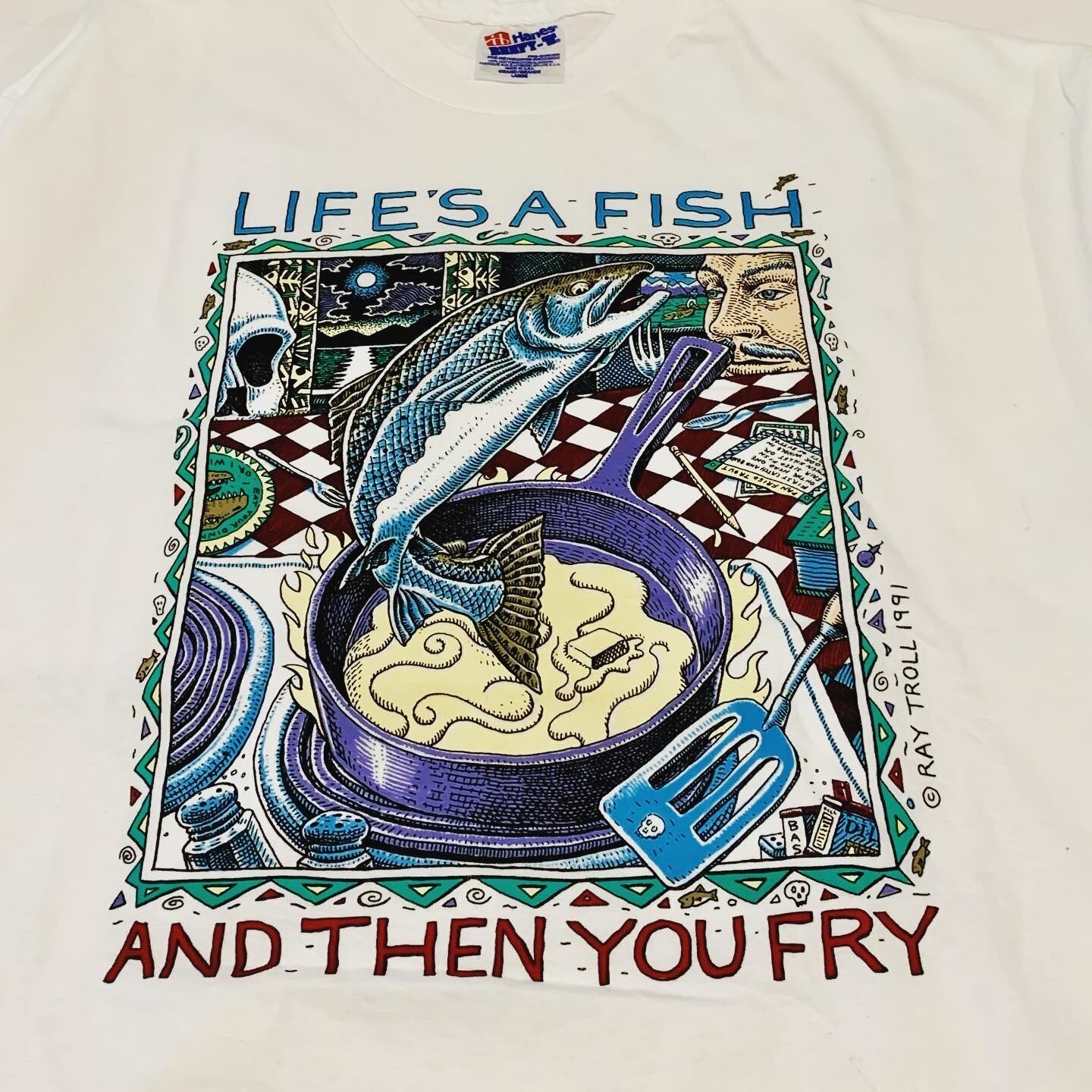 アメリカのアーティスト、レイ・トロールのプリントTシャツです。90年代アメリカ製ヘインズボディの袖、裾はシングルに仕上げられております。