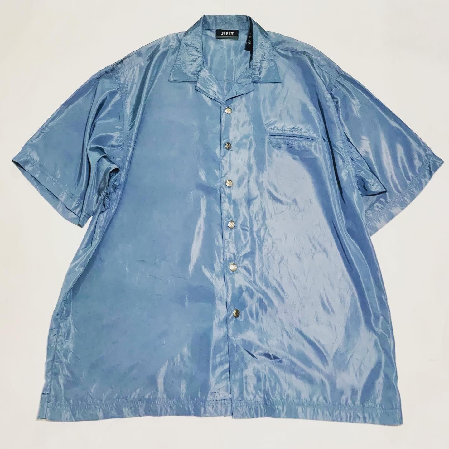アセテート、ナイロン生地のショートスリーブシャツです。しゃりしゃりとして光沢があり涼しげな1枚で、