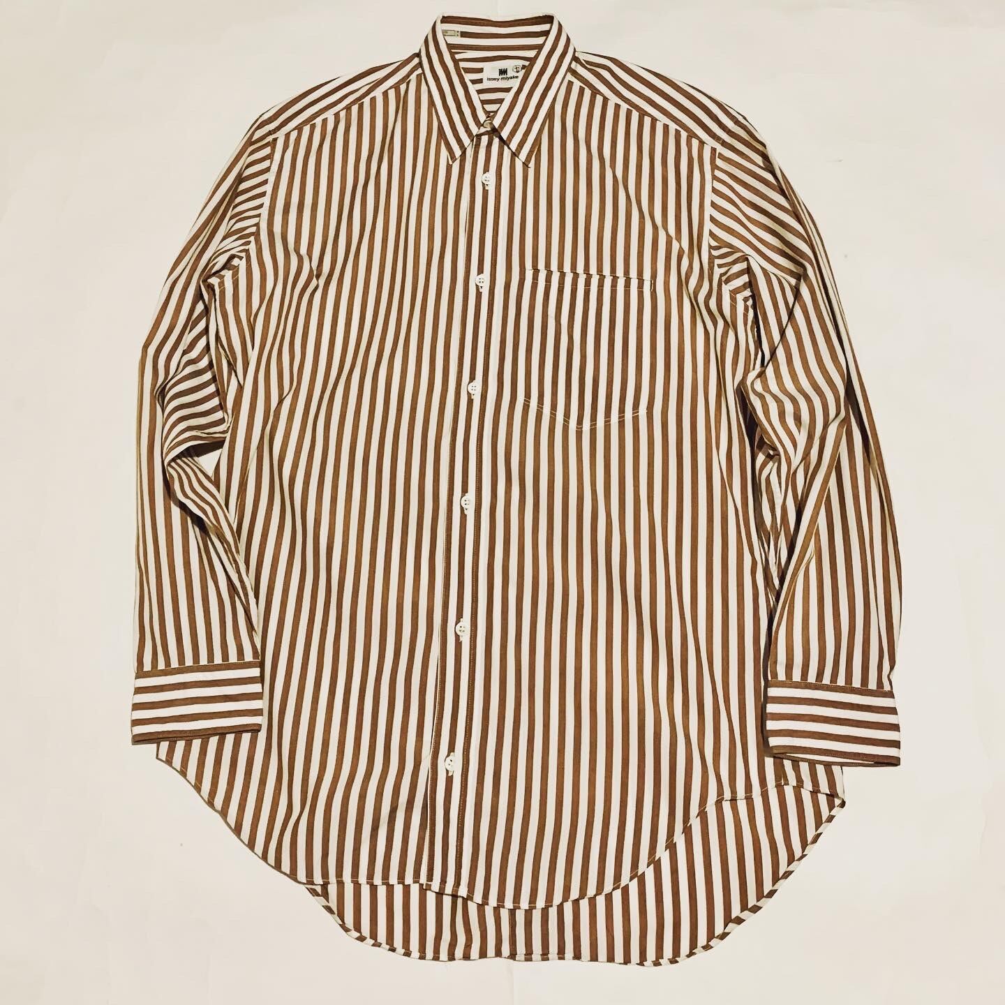 ライトブラウンのコットンストライプシャツは、日本のブランドイッセイミヤケから。
