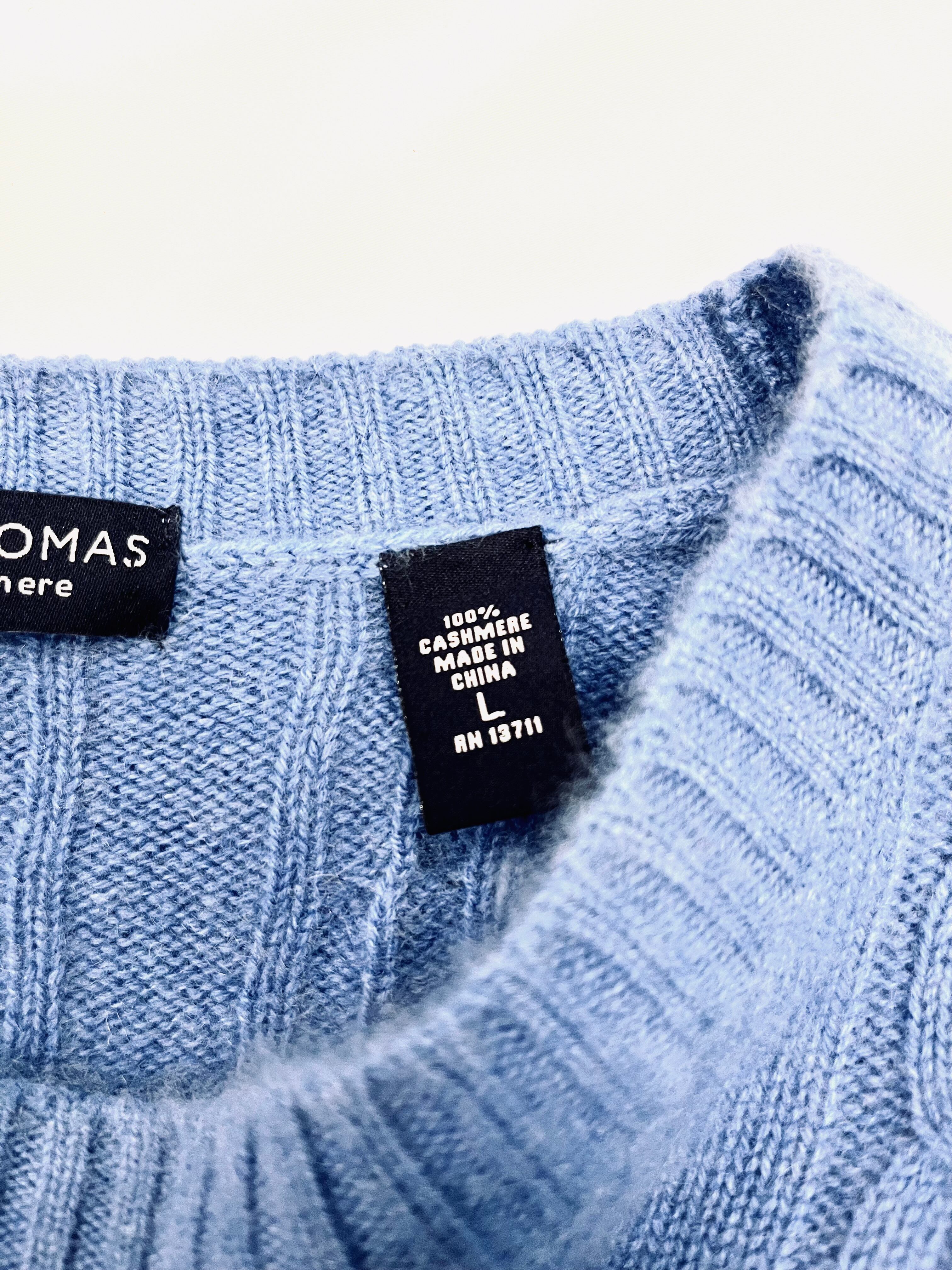 ライトブルーの綺麗なカシミアニット。上質で肌触りの良いオールカシミア、ふわふわとした肌触り最高です。