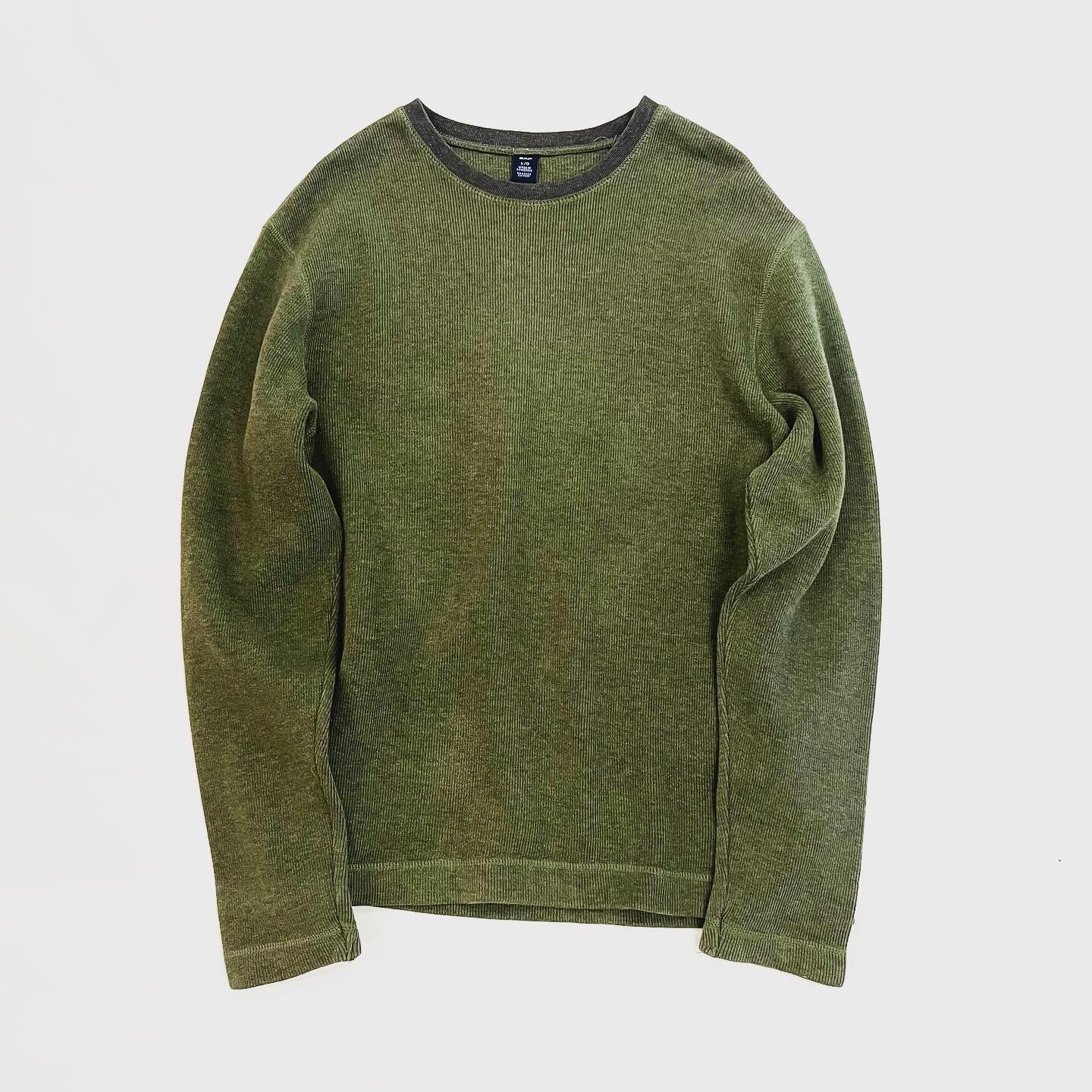 ギャップのコットンニット。オリーブにネックのチャコールグレーがアクセント。