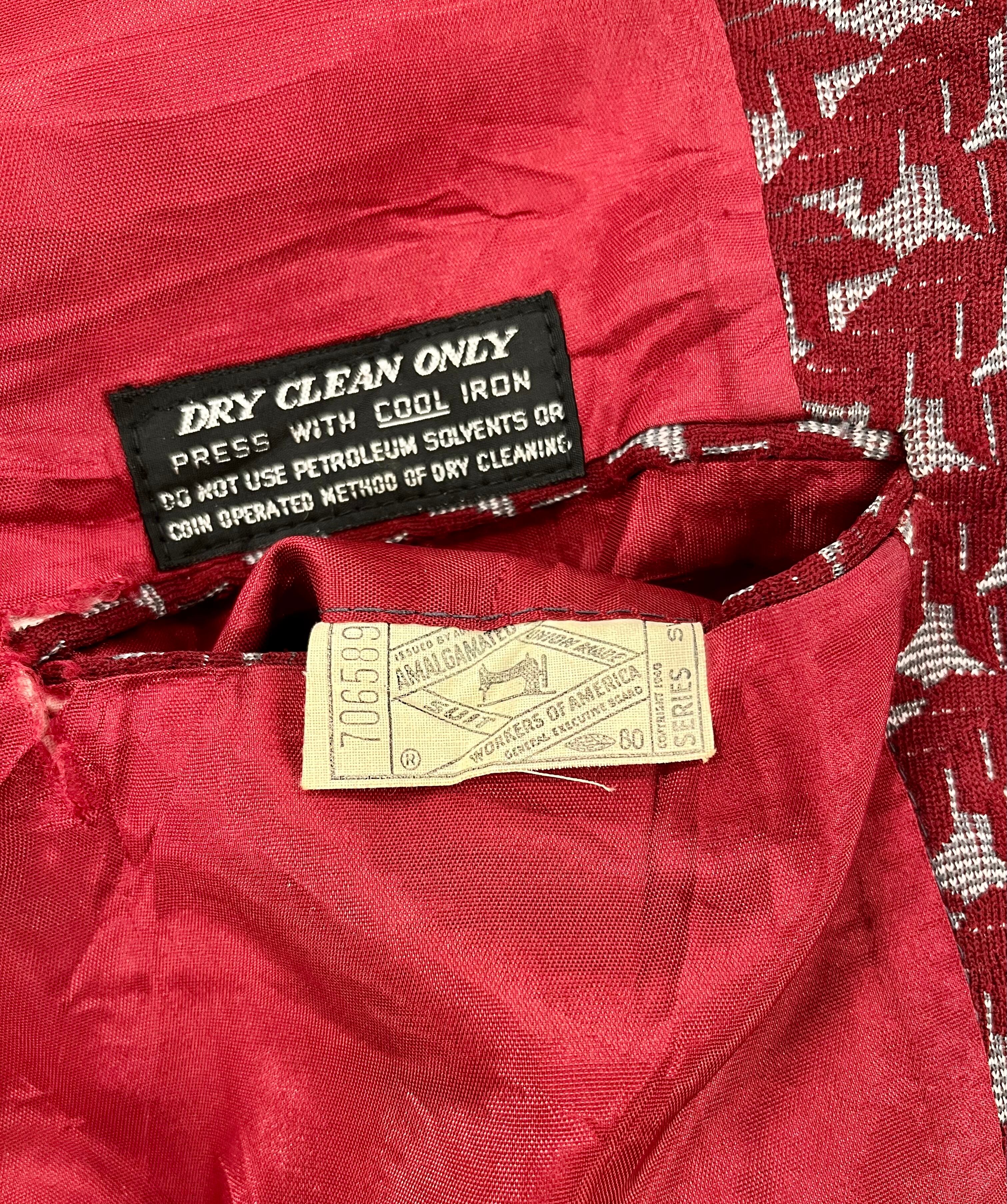 70年代と思われる、ポリエステルジャガードのテーラードジャケット。豪華で華やかな大ぶりな襟が70年代ならではのディテール。ウールでジャガード物がほとんどの中、こちらはポリエステルってところも素晴らしい。