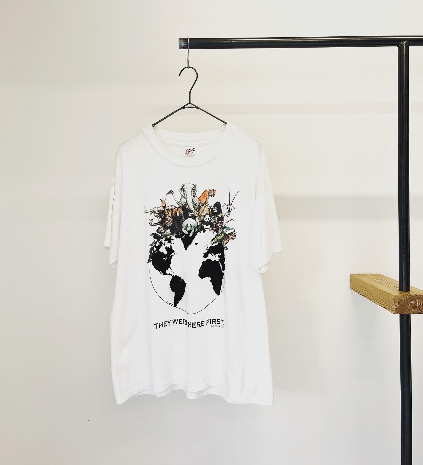 [彼らは最初はここにいた]と環境保護を訴えたメッセージ性の高いTシャツです。地球上に動物達とプリントも非常に良いです。