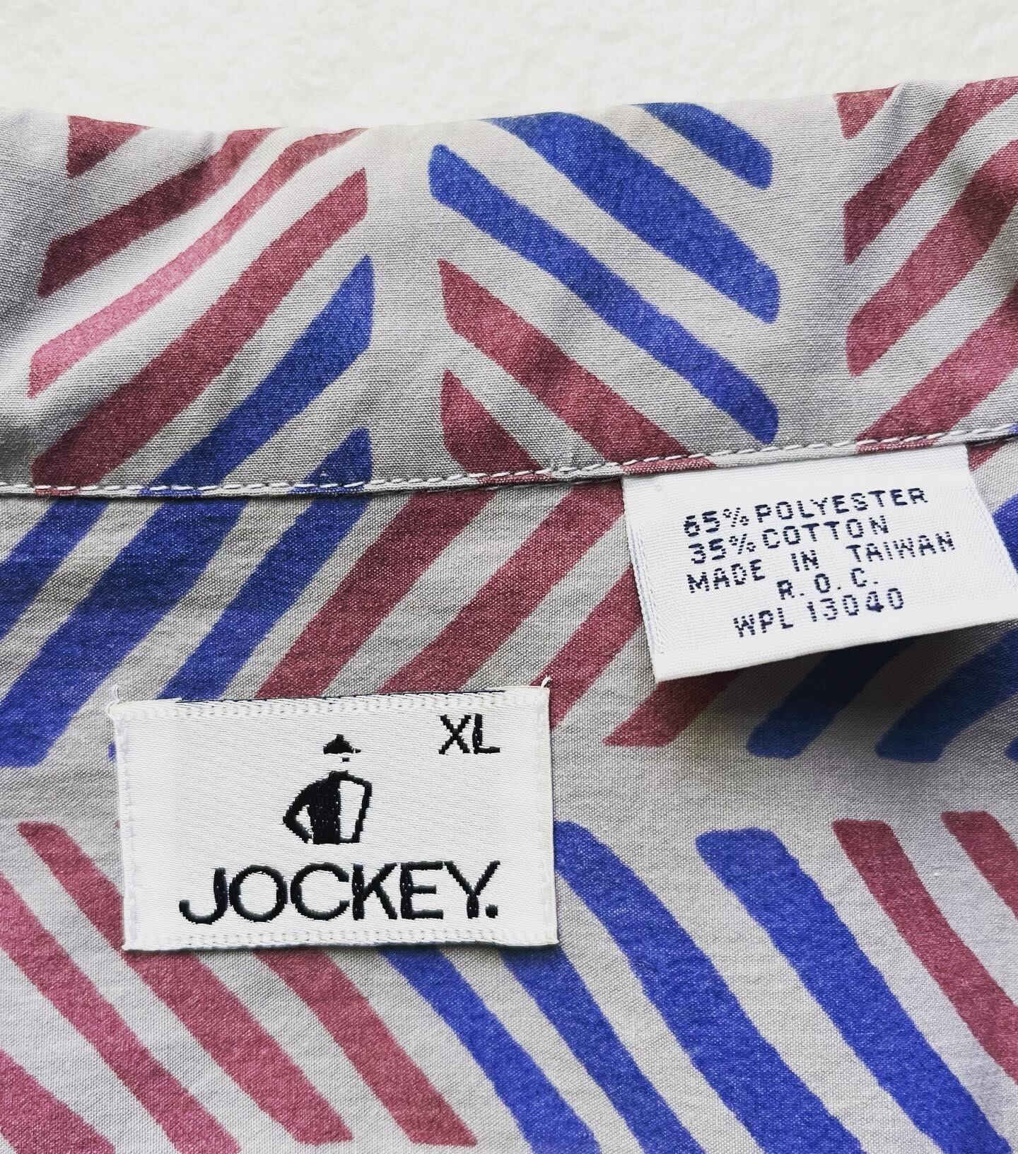 グレーベースに、赤と青の独特で不思議な柄が目を惹きます。コットン、ポリのシャリシャリとしてハリのある生地感。