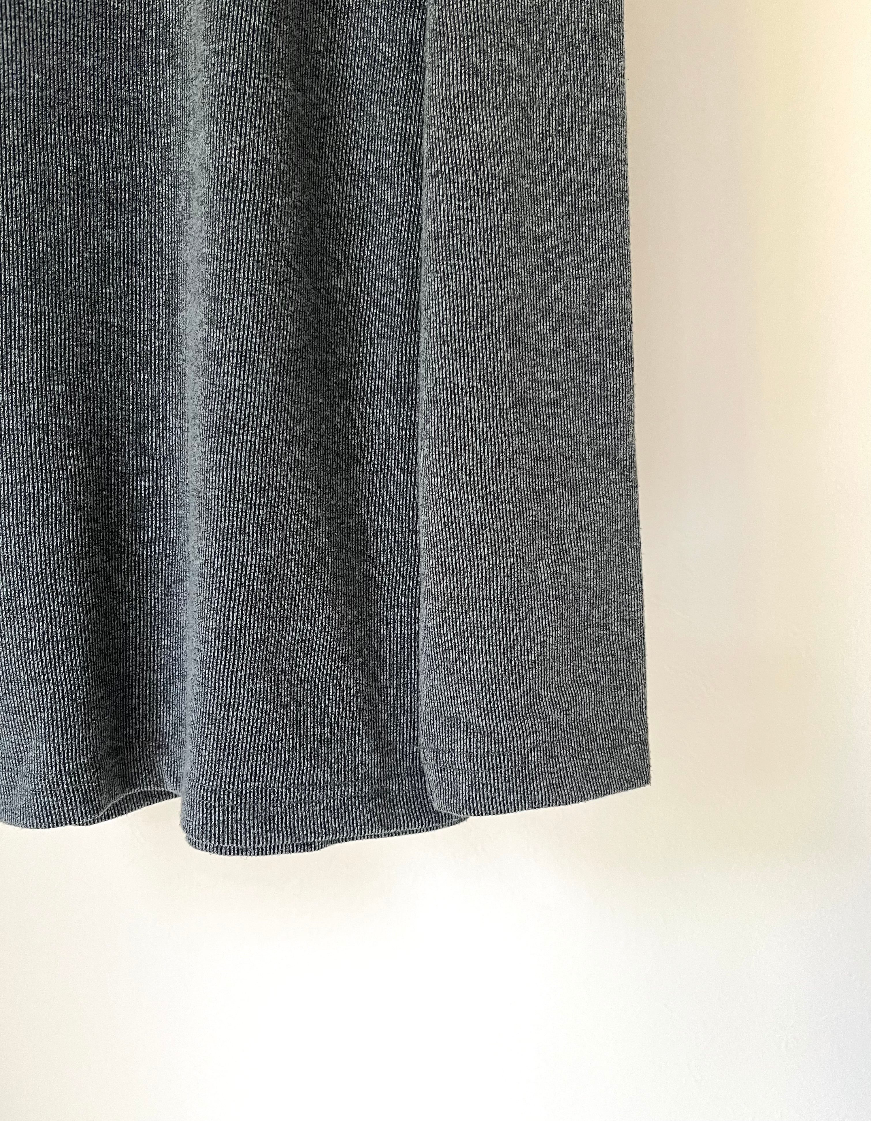 細くストライプの織りが入る、薄手のニット。何色と表現しづらい絶妙なカラーリングです。