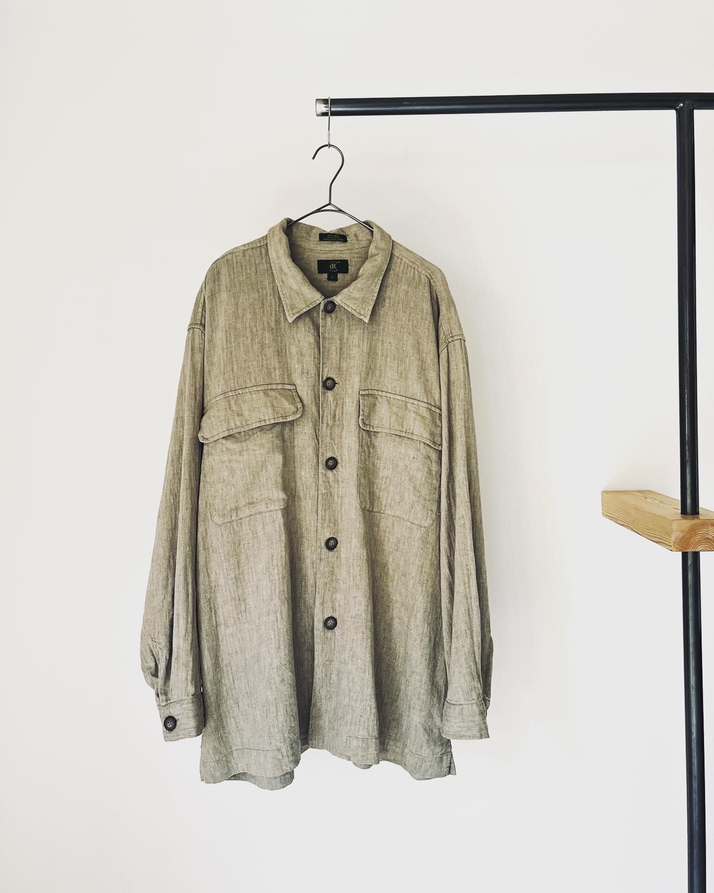 シャツとジャケットの要素をミックスした印象です。大きく付いた、フラップポケット。身幅ゆったりとしてスリットが入る、ボックススタイル。どのようなパンツにも、相性の良いカーキ。