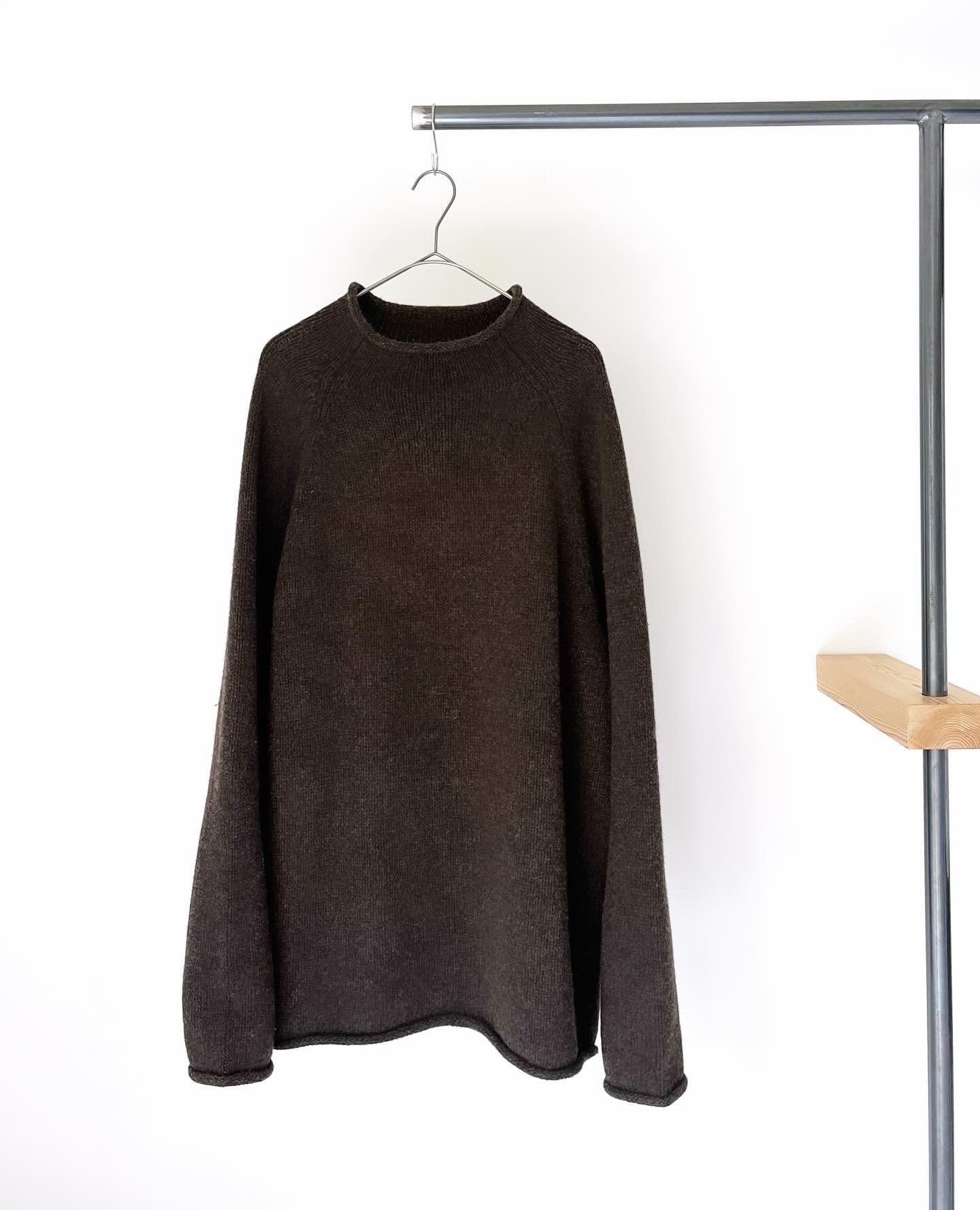 チクチクとした肌触りの少ない、しなやかなラムウールがクセになりますね。インナーで使う際にもネック、裾、袖部分のロールがアクセントになっております。