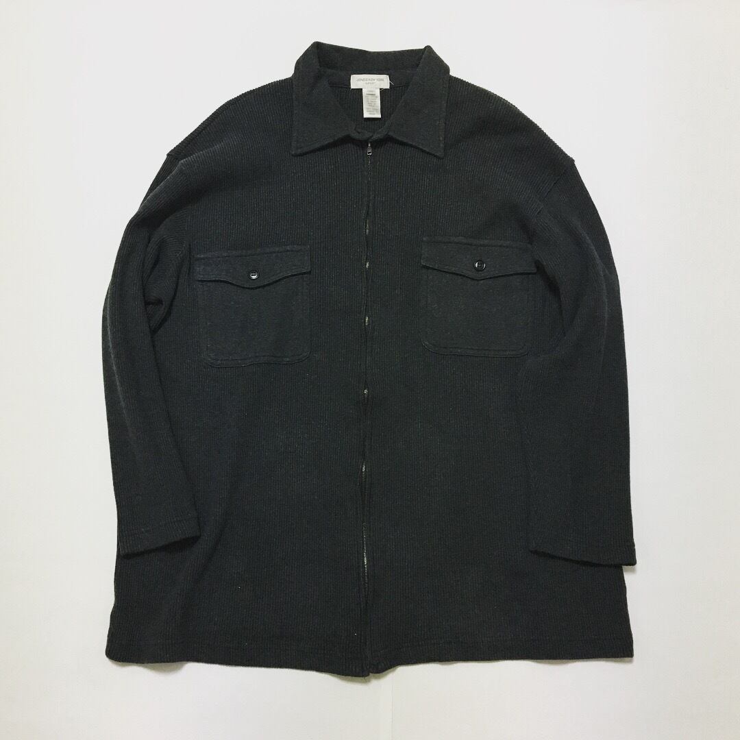 リブ編みで作られたコットンニットシャツです。襟部分はリブ編みではなく、コットン生地での切り替えも良いですね。ボタンではなくジップアップというところも、気にいっております。チャコールグレーという落ちついたカラーリングの為、合わせやすく、取り入れやすいアイテムです。