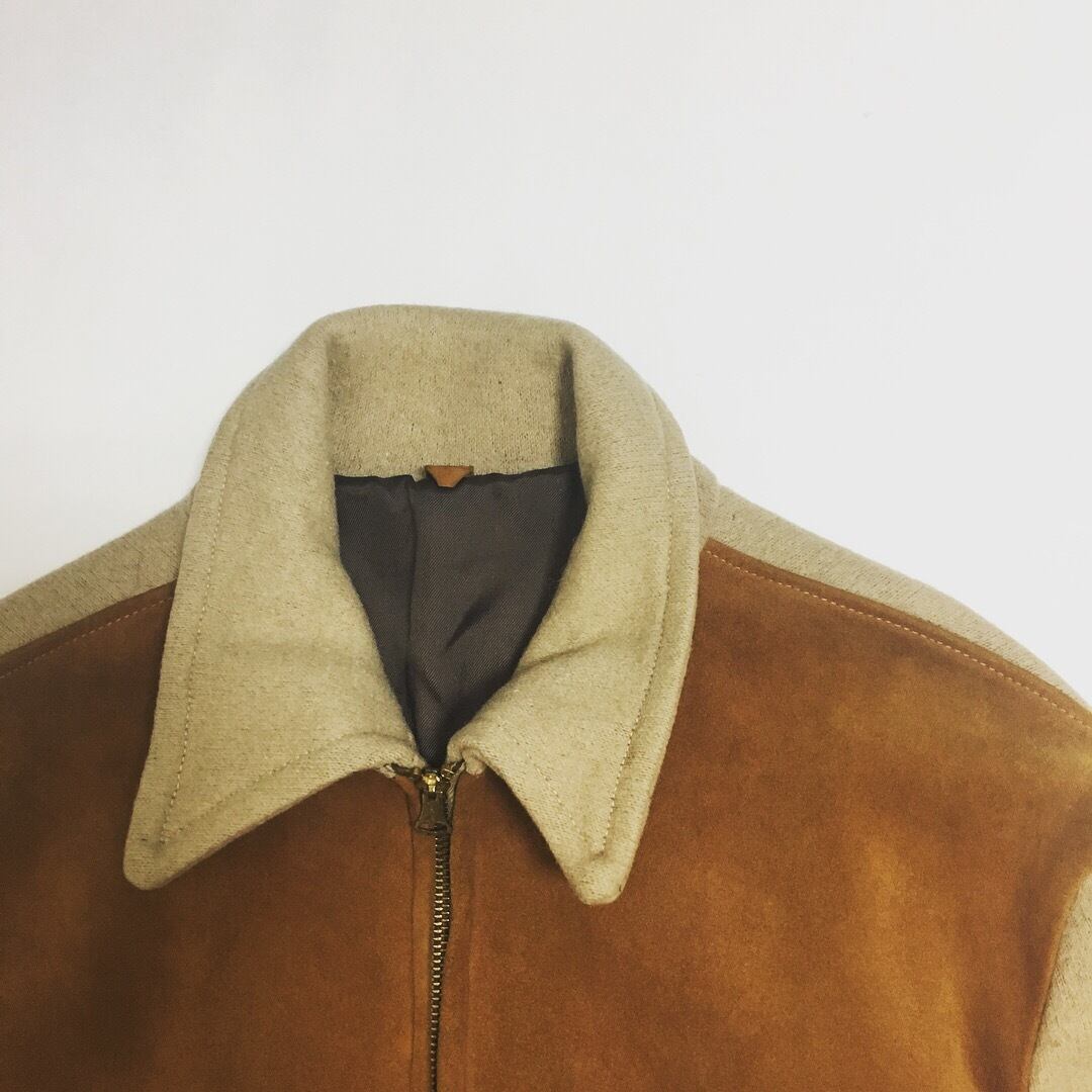40年代のウールとスエードの切り替えが素敵なジャケットです。ベージュと、ブラウンという配色の良さも際立っております。リブは袖部分のみオリーブカラーに切り替えられているところも良いですね。