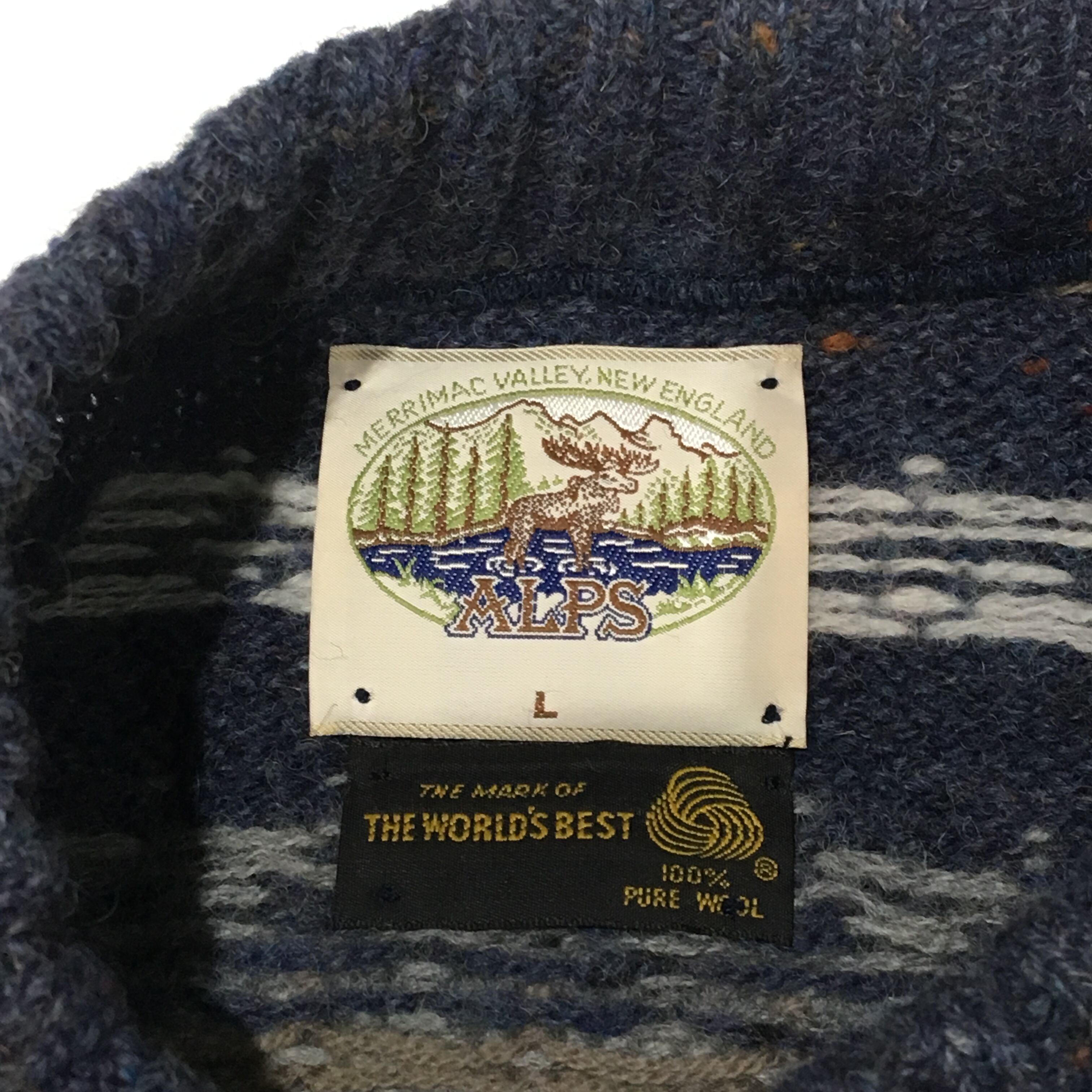 ネイビーベースに柄が散りばめられた、ウールニットです。所々に入るオレンジやブルーのネップも良いアクセントになっております。ピュアウール100%で化学繊維も使っていないところも良いですね。