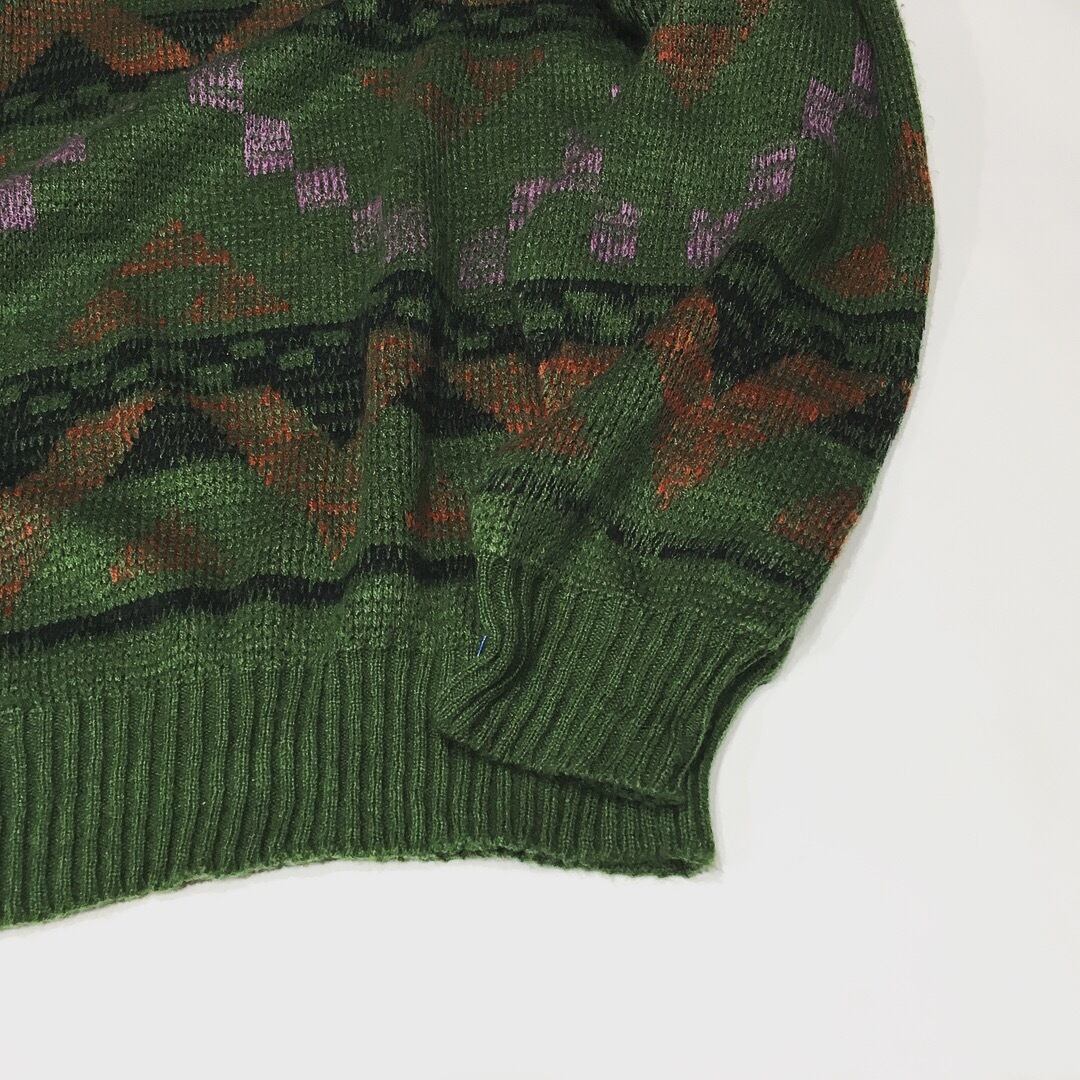 深いカーキベースのアクリルニットです。柄は派手すぎず、取り入れやすいアイテムに仕上がっております。ウール特有のチクチクとした肌触りがなくライトに着て頂けます。